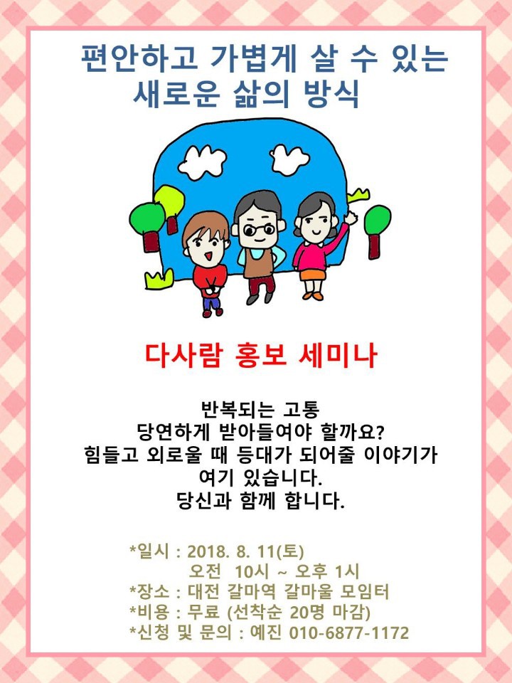 편안하고 가볍게 살 수 있는 새로운 삶의 방식 작성자봄날|작성시간18.07.27|조회수4 목록 댓글 0 글자크기 작게가 글자크기 크게가 반복되는 고통 당연하게 받아들여야 할까요? 힘들고 외로울 때 등대가 되어줄 이야기가 여기 있습니다. 당신과 함께 합니다. 다음검색 현재 게시글 추가 기능 열기 북마크 공유하기 신고 센터로 신고 댓글 댓글 0 댓글쓰기 답글쓰기 댓글 리스트