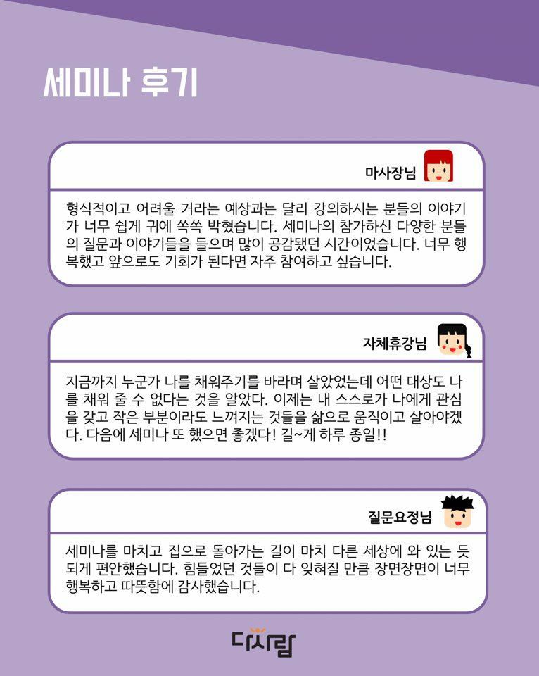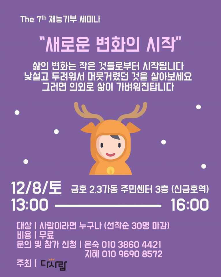 다사람 재능기부 무료 세미나 작성자봄날|작성시간18.12.01|조회수3 목록 댓글 0 글자크기 작게가 글자크기 크게가 다음검색 현재 게시글 추가 기능 열기 북마크 공유하기 신고 센터로 신고 댓글 댓글 0 댓글쓰기 답글쓰기 댓글 리스트