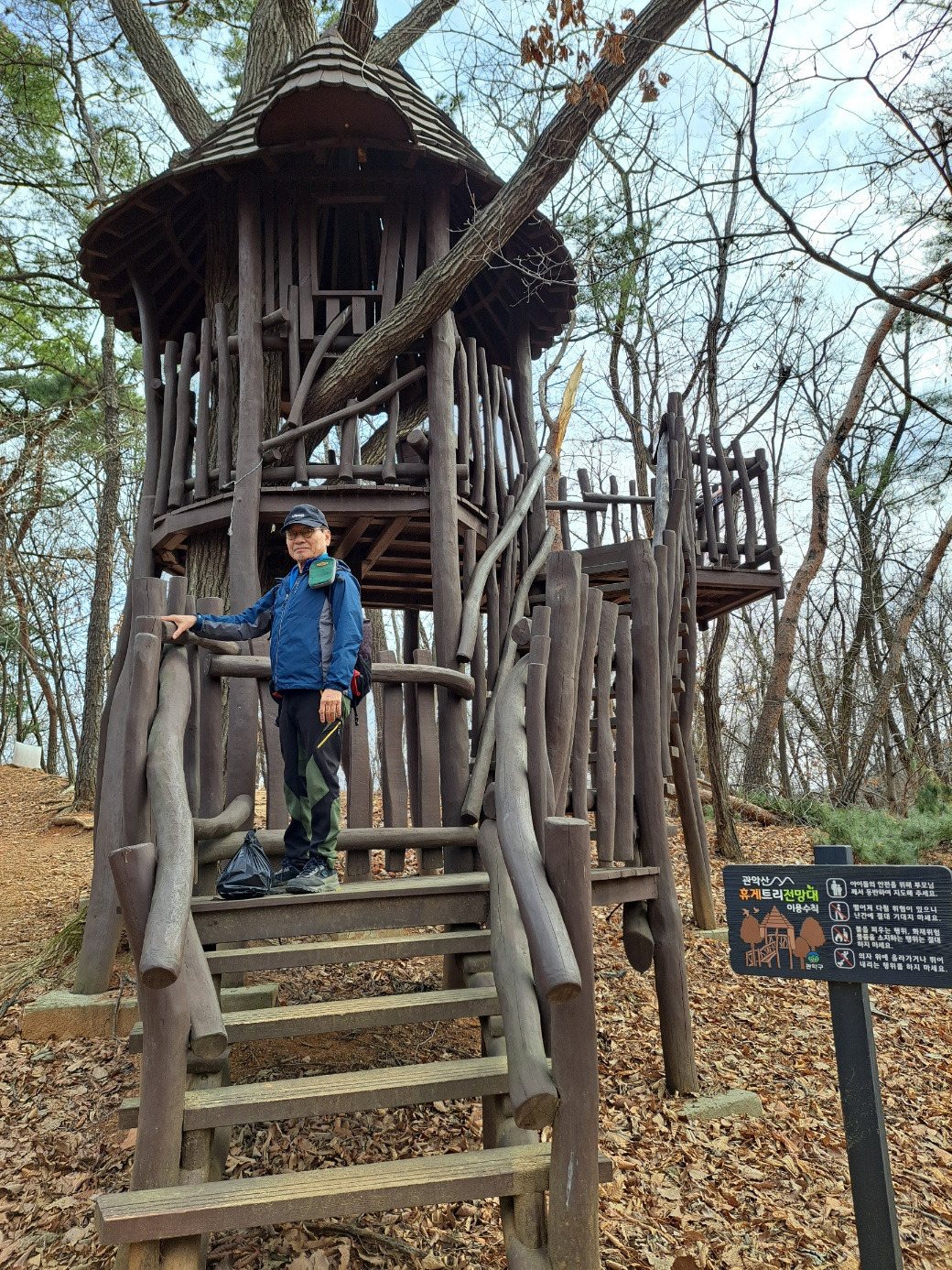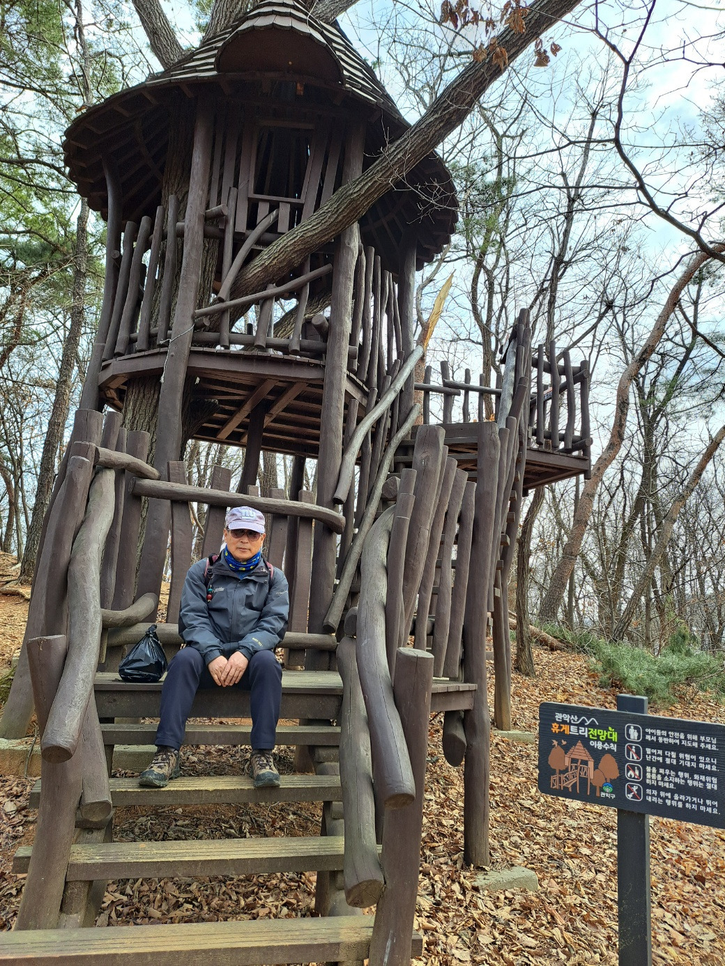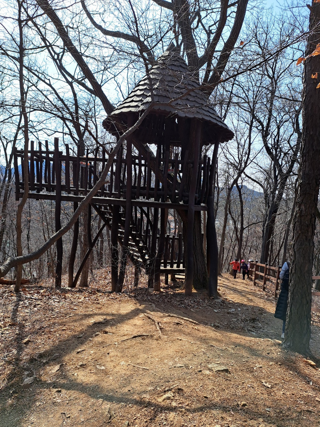 전망대라기 보다는 쉬어가는 곳인데, 재미있게도 살아있는 참나무를 그대로 살려서 원두막 같이 만들었다.