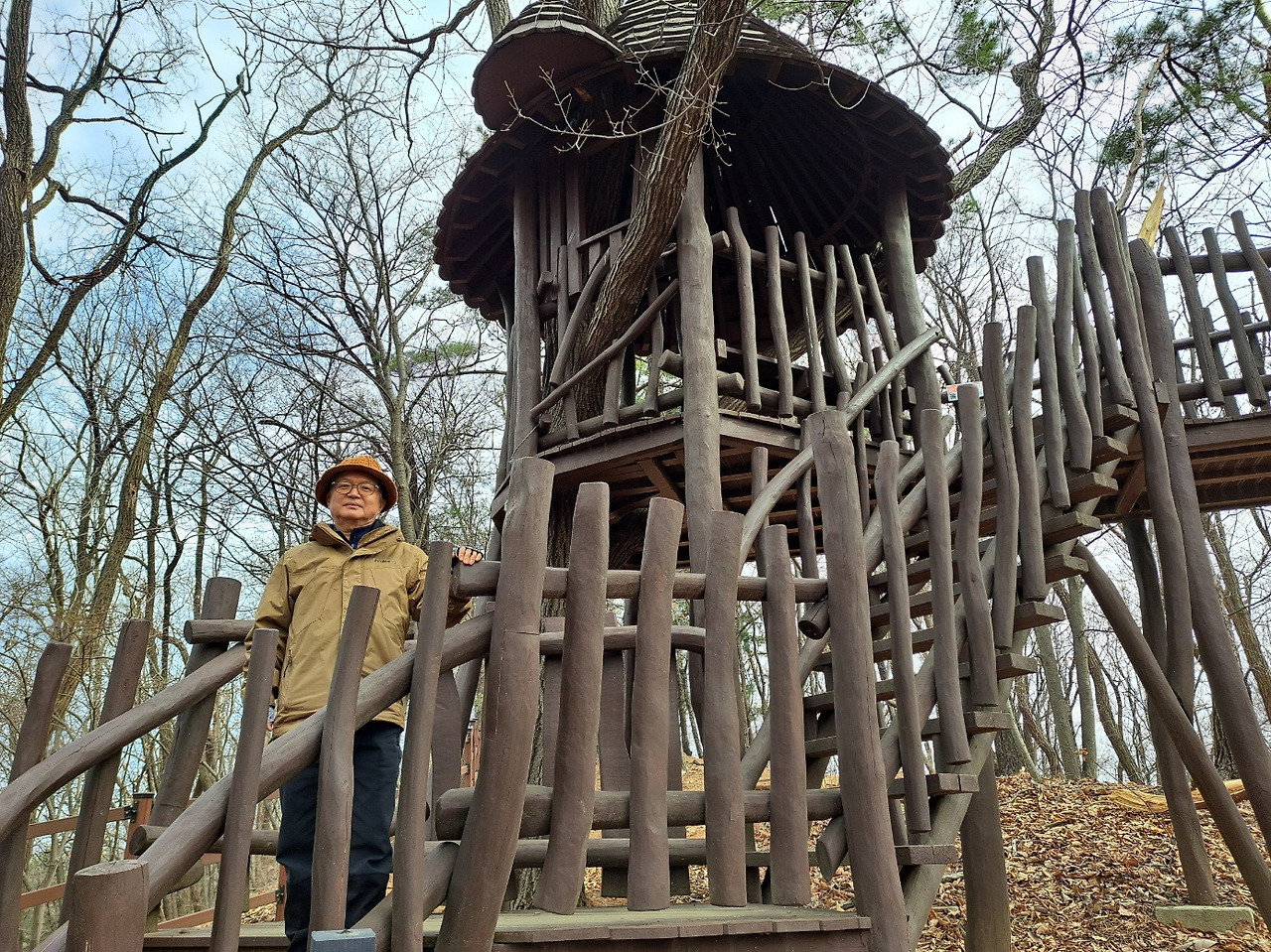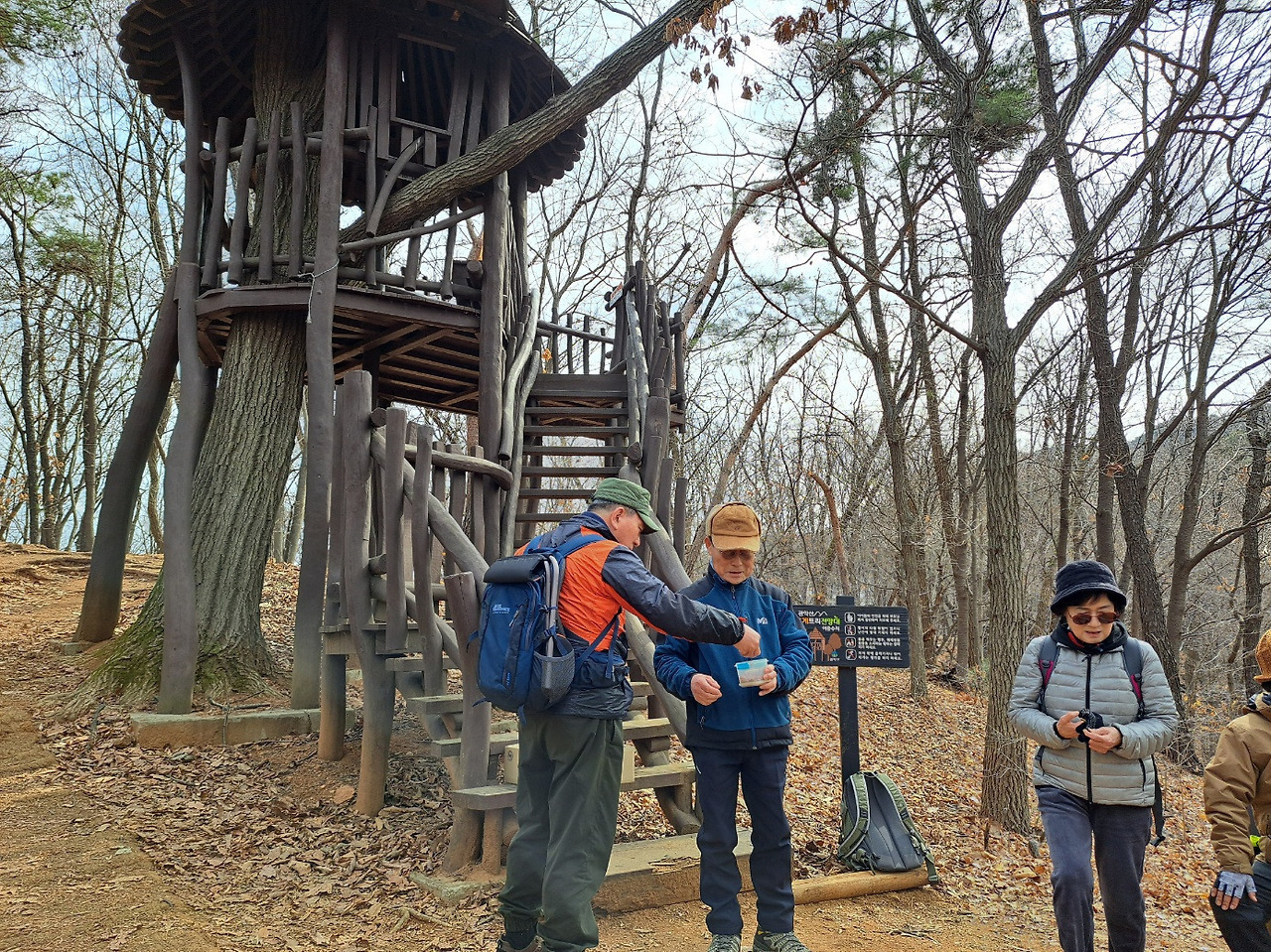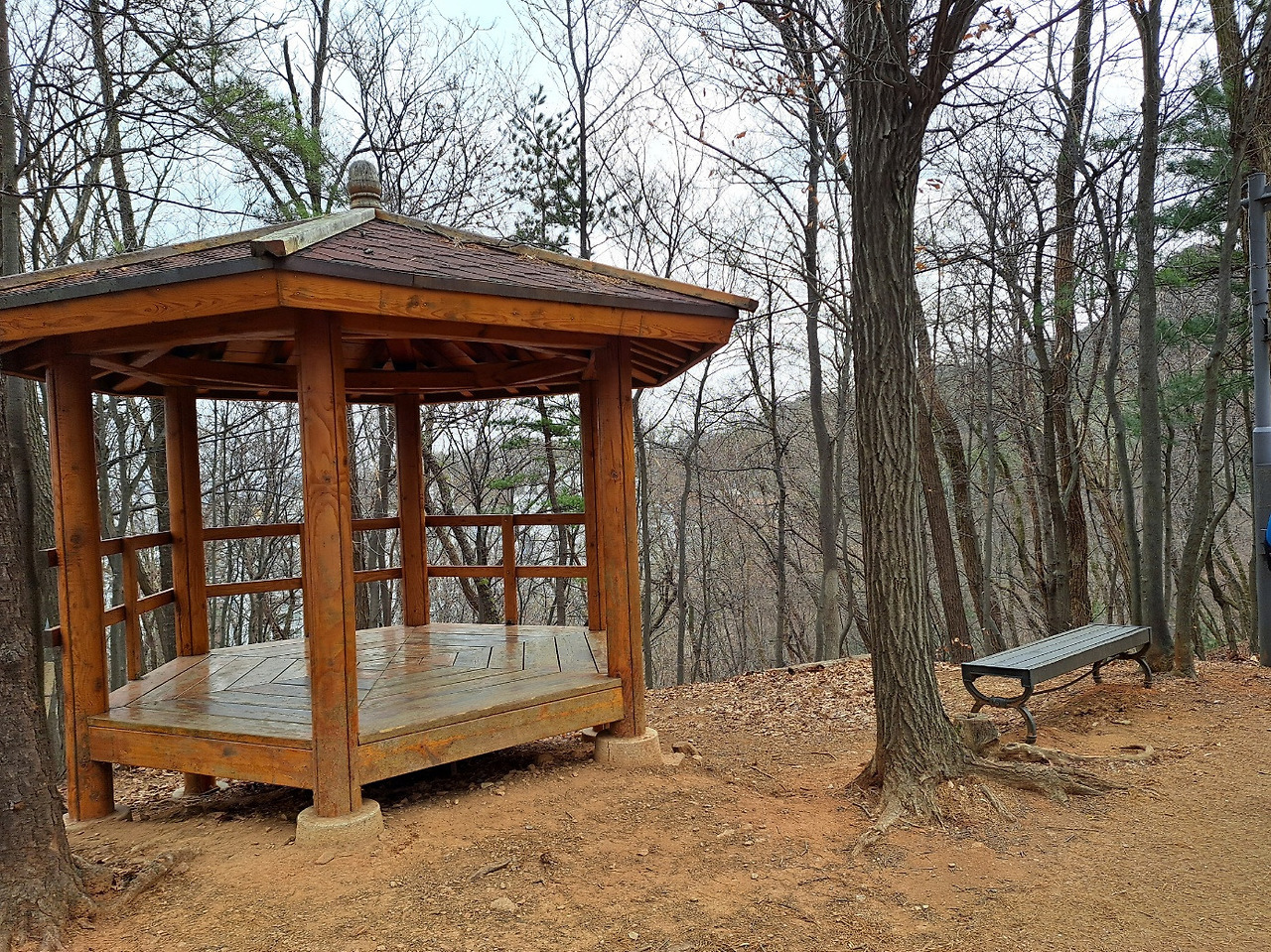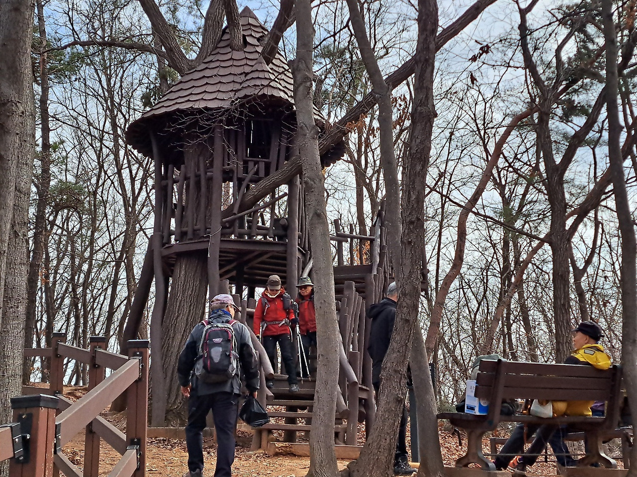 전망대라기 보다는 쉬어가는 곳인데, 재미있게도 살아있는 참나무를 그대로 살려서 원두막 같이 만들었다.