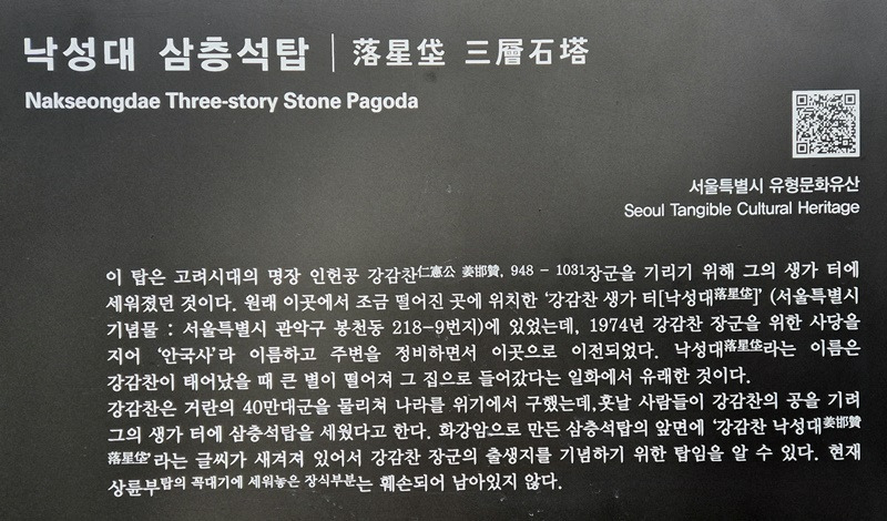 강감찬낙성대(姜邯贊落星垈)라는 명문이 새겨진 삼층석탑은 고려시대에 조성한 것으로 추정되며