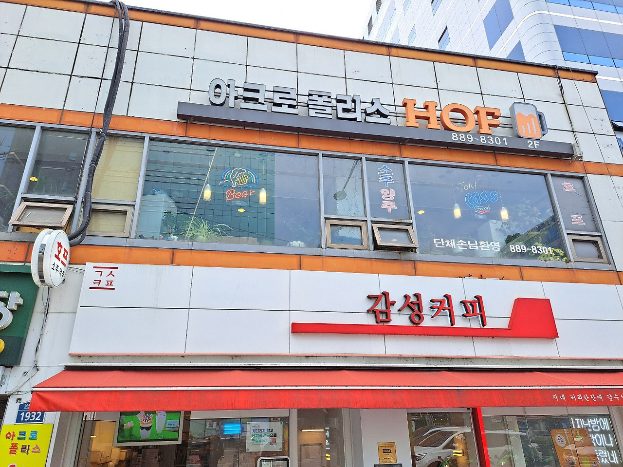 낙성대역 3번 출구 앞에 있는 2층 아크로폴리스 호프집이다