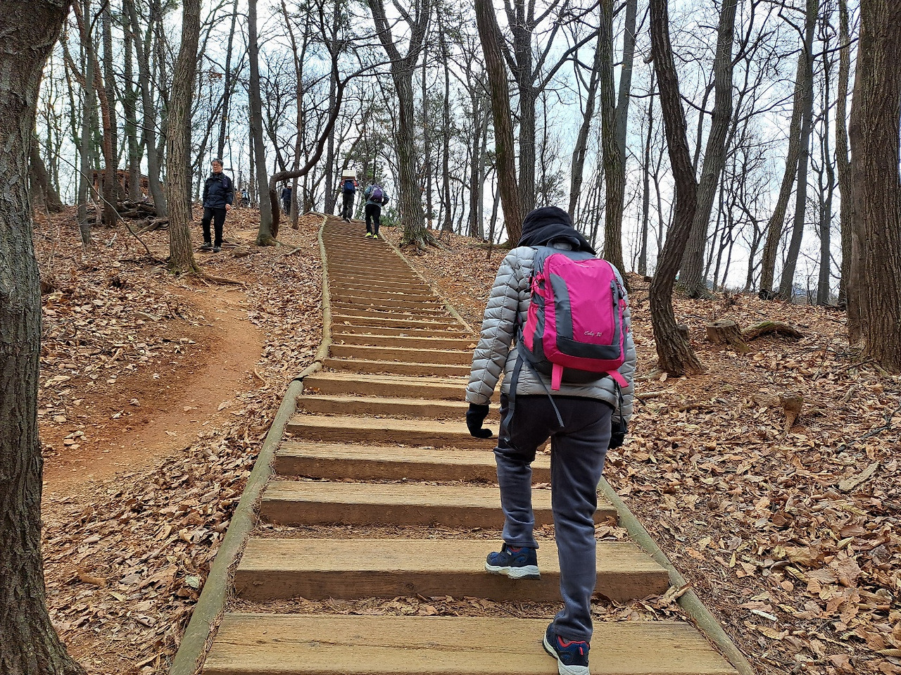관악산 둘레길 1코스인 숲속길을 올라간다. 초입엔 나무테크길과 야자메트길이다.
