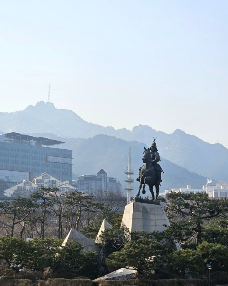 낙성대공원에서 강감찬 장군 동상과 관악산의 모습...