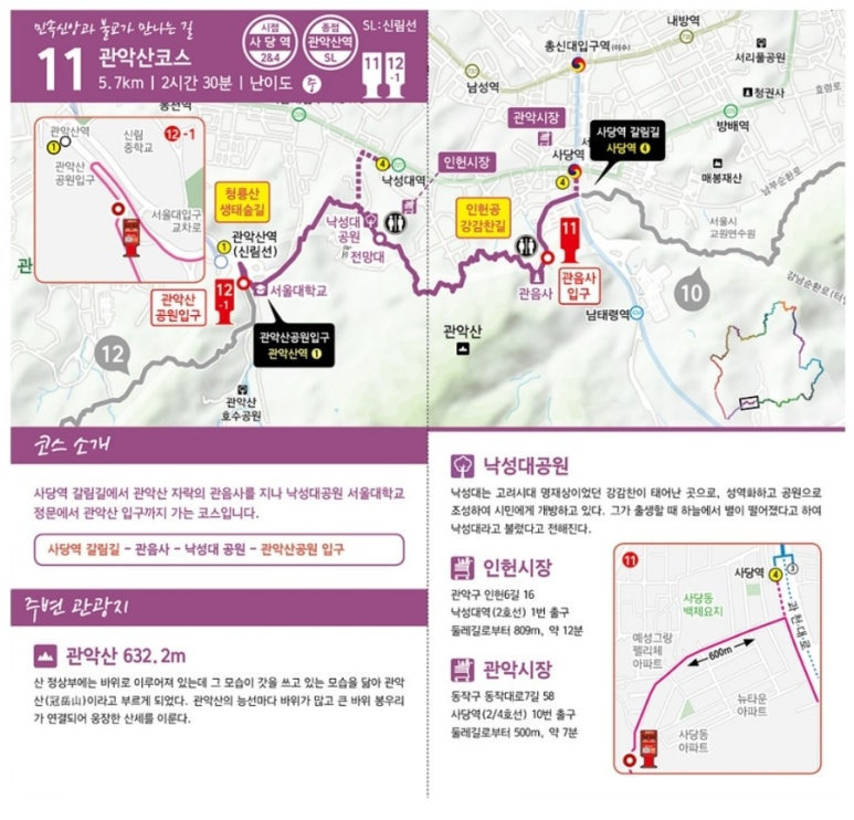 사당역4번출구에서 출발하여 관악산 자락의 관음사를 지나 낙성대공원을 경유하여 서울대 정문까지 가는 5.7km코스이지만..,
