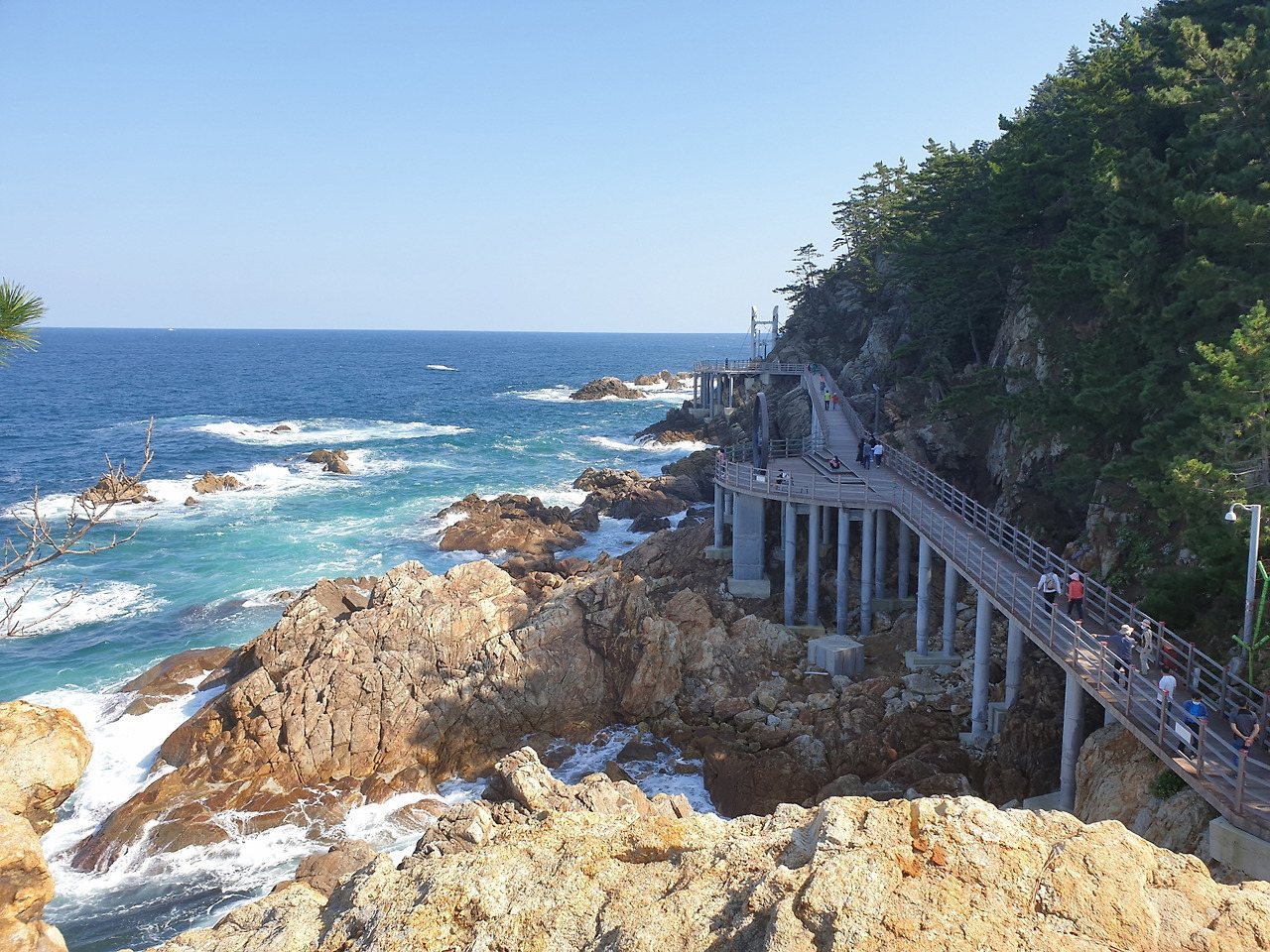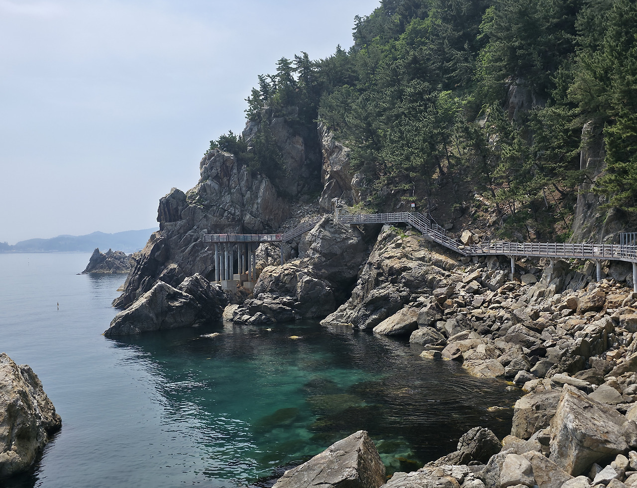 오른쪽에는 기암절벽과 소나무들이 있고, 왼쪽은 삼척해변을 끼고 있어서 전망이 너무 좋다.