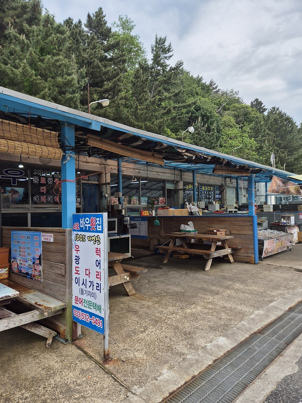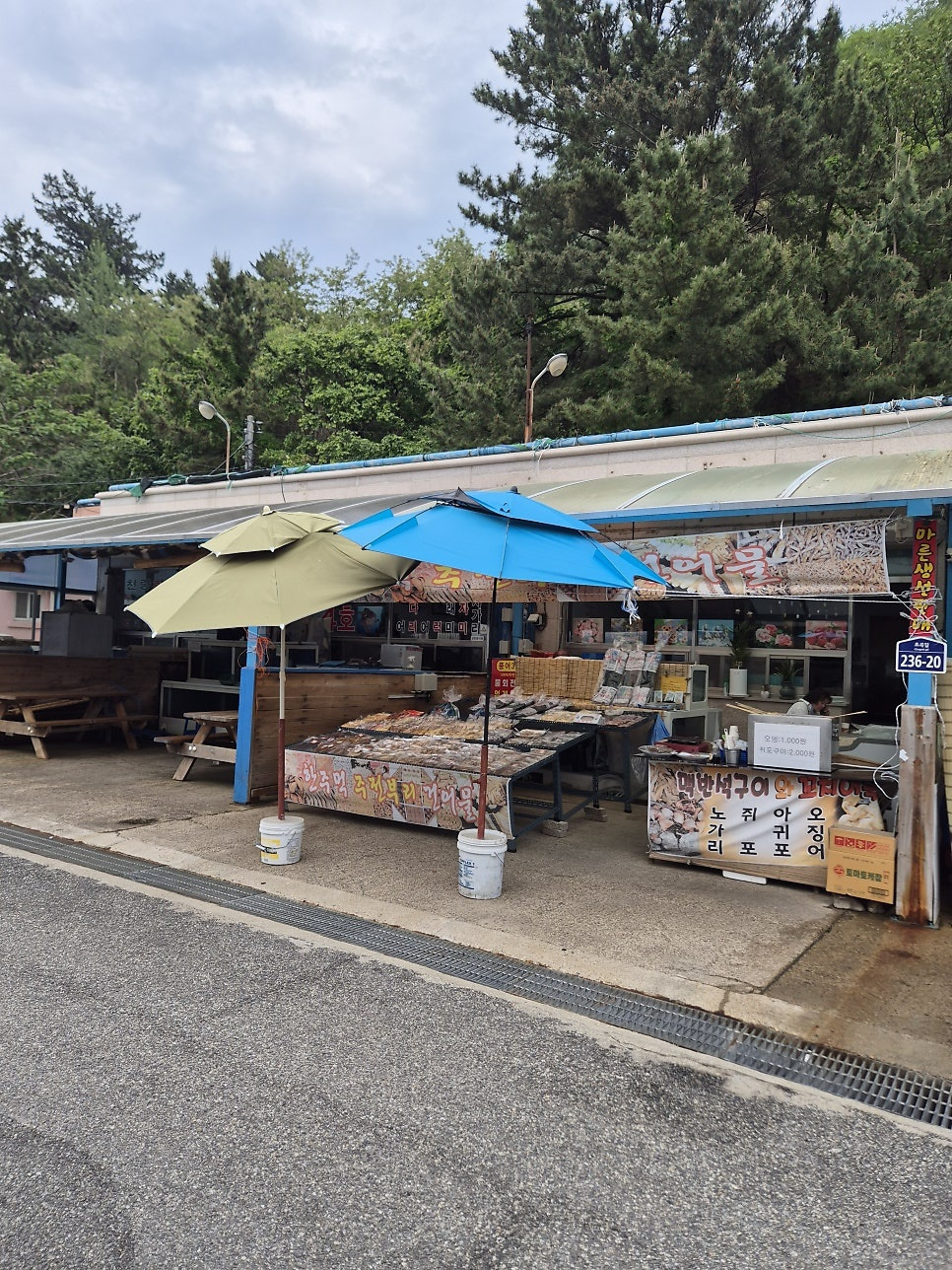 촛대바위로 가는 길목에는 횟집과 건어물 가계들이 군데군데 있다.