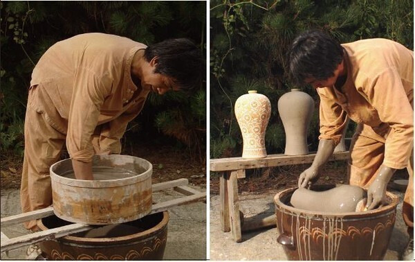 발로 열심히 문래를 돌리며 항아리를 만들고 있었어요