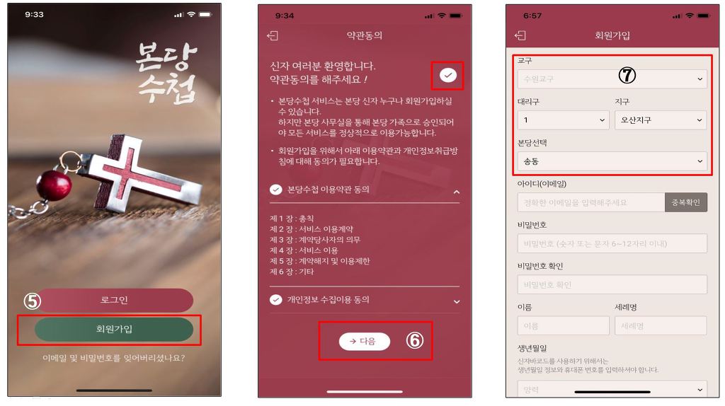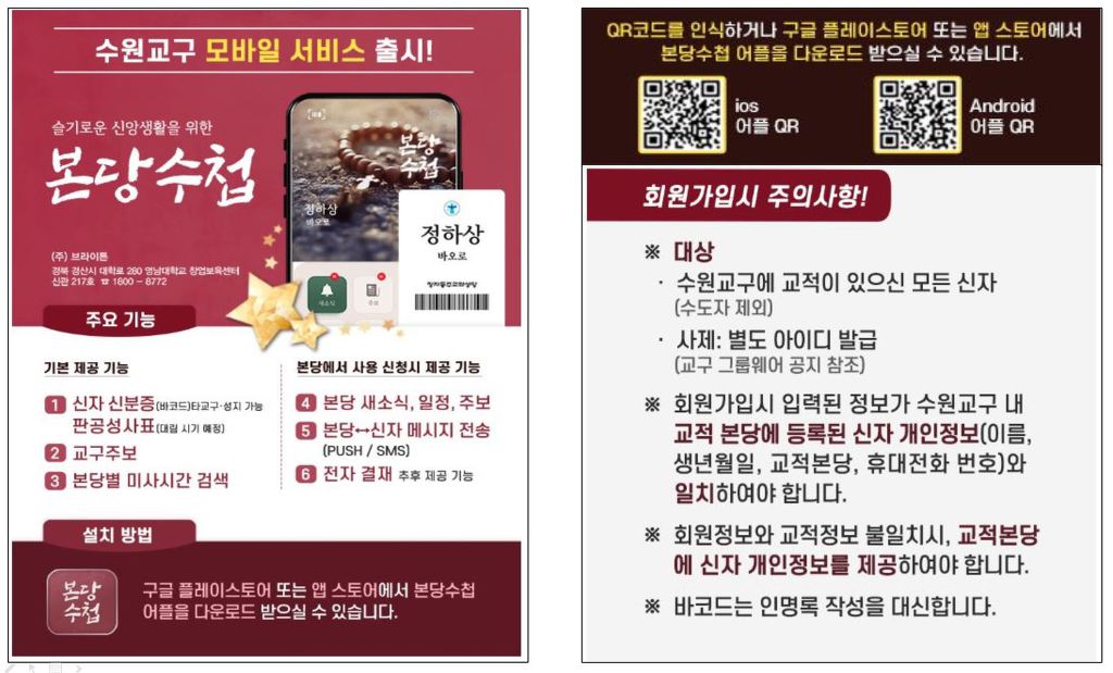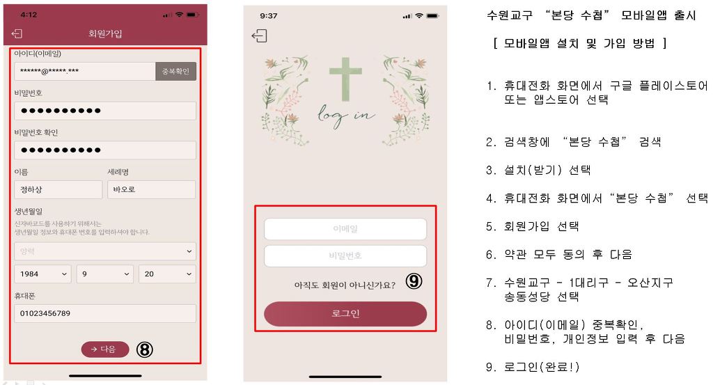 : 회원가입 시 ① 이름 ② 생년월일 ③ 휴대전화 번호 ④ 교적본당을