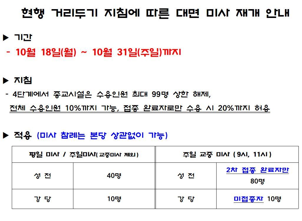 현행 거리두기 지침에 따른 대면 미사 재개 안내 (10/18시행) 작성자동탄송동성당|작성시간21.10.16|조회수330 목록 댓글 0 글자크기 작게가 글자크기 크게가 다음검색 현재 게시글 추가 기능 열기 북마크 공유하기 신고 센터로 신고 댓글 댓글 0 댓글쓰기 답글쓰기 댓글 리스트