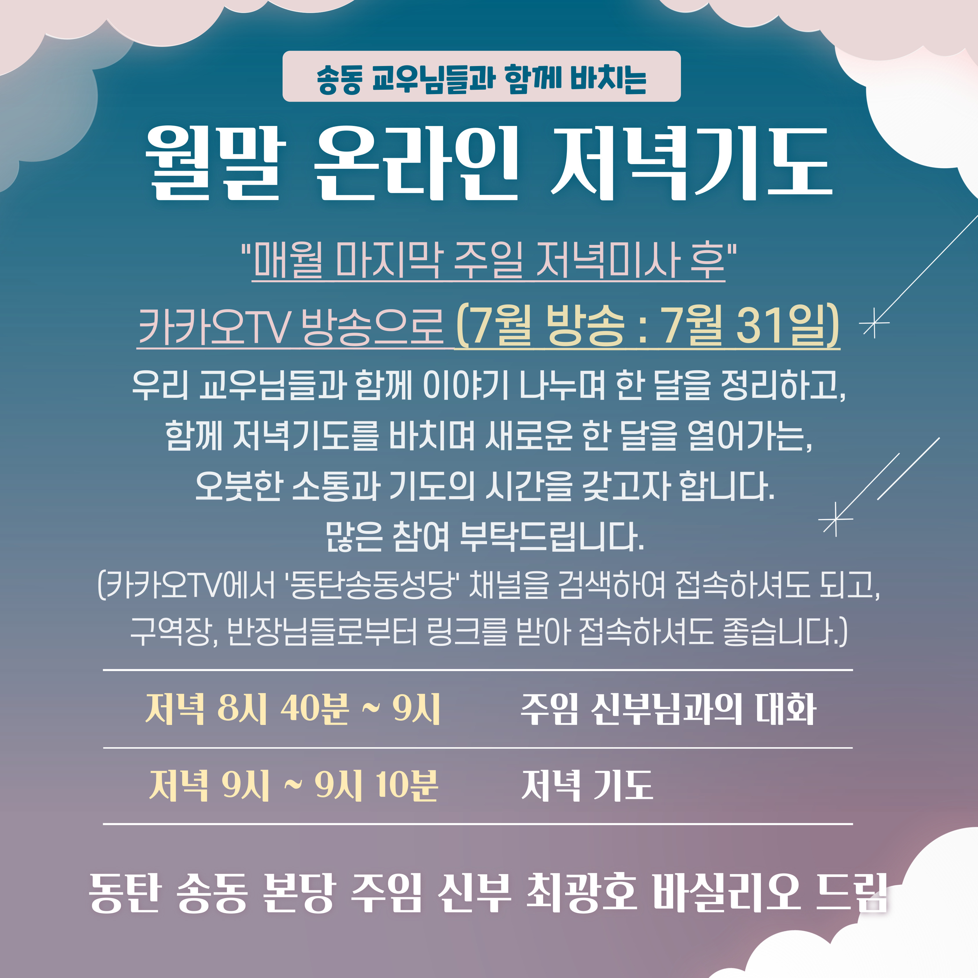 7월 온라인 저녁기도 안내문 작성자최광호 바실리오|작성시간22.07.26|조회수99 목록 댓글 0 글자크기 작게가 글자크기 크게가 7월부터는 8시 40분부터 방송을 시작합니다. 다음검색 현재 게시글 추가 기능 열기 북마크 공유하기 신고 센터로 신고 댓글 댓글 0 댓글쓰기 답글쓰기 댓글 리스트