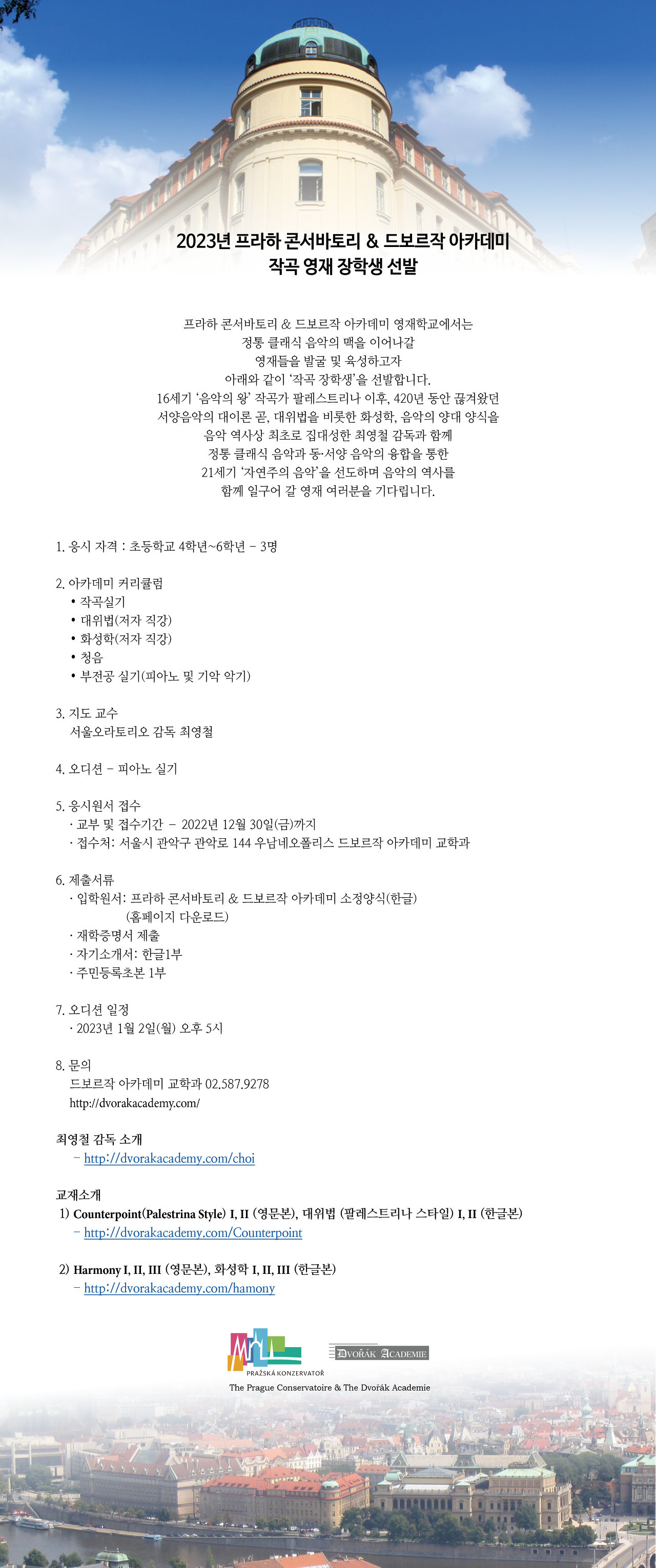 드보르작 아카데미 교학과 02.587.9278 http://dvorakacademy.com/ 최영철 감독 소개 - 바로가기 http://www.seouloratorio.or.kr/choii 교재소개 1) Counterpoint(Palestrina Style) I, II (영문본), 대위법 (팔레스트리나 스타일) I, II (한글본) - 바로가기 http://dvorakacademy.com/Counterpoint 2) Harmony I, II, III (영문본), 화성학 I, II, III (한글본) - 바로가기 http://dvorakacademy.com/hamony |