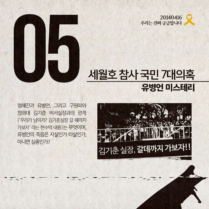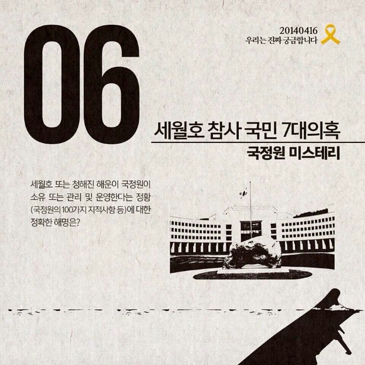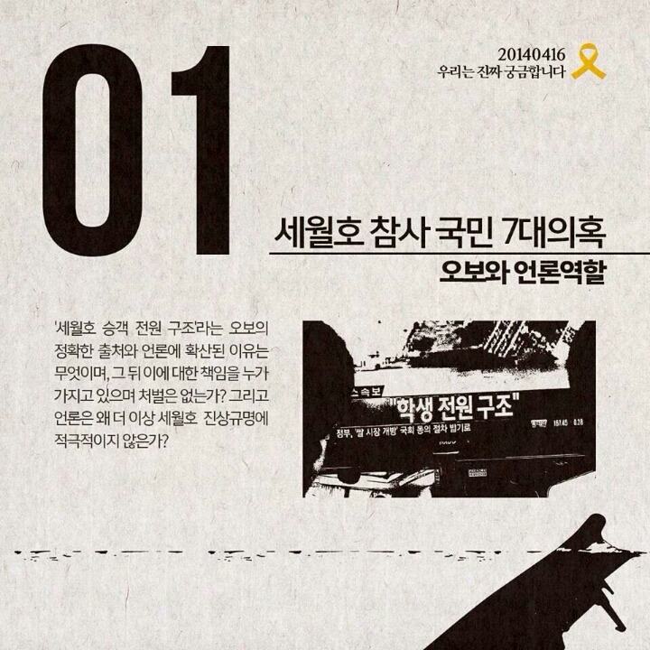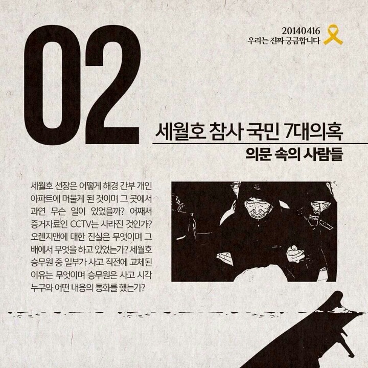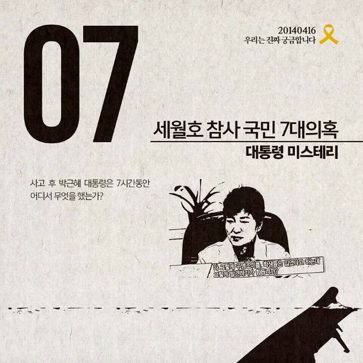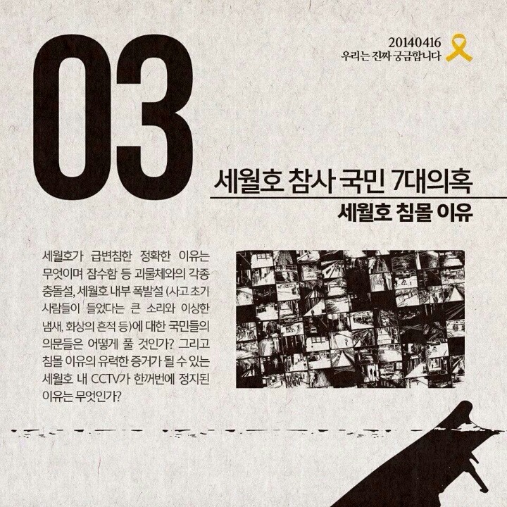 세월호참사 7대의혹 작성자그루터기|작성시간14.09.06|조회수137,727 목록 댓글 2 글자크기 작게가 글자크기 크게가 세월호 참사의 7대의혹입니다널리 배포하여 함께 공유할수 있도록 부탁드립니다 다음검색 현재 게시글 추가 기능 열기 북마크 공유하기 신고 센터로 신고 댓글 댓글 2 댓글쓰기 답글쓰기 댓글 리스트 작성자그루터기 작성자 본인 여부 작성자 | 작성시간 14.09.06 모바일 등록하니 순서가 거꾸로 되었네요^^ 작성자길목 | 작성시간 14.09.08 하나하나 밝혀내다보면 어디까지 갈지는 모르지만, 반드시 밝혀내야지요, 그 때까지 지치지 말고 갑시다, 우리... 날마다 좋은 날!!! - 풀 - 댓글 전체보기