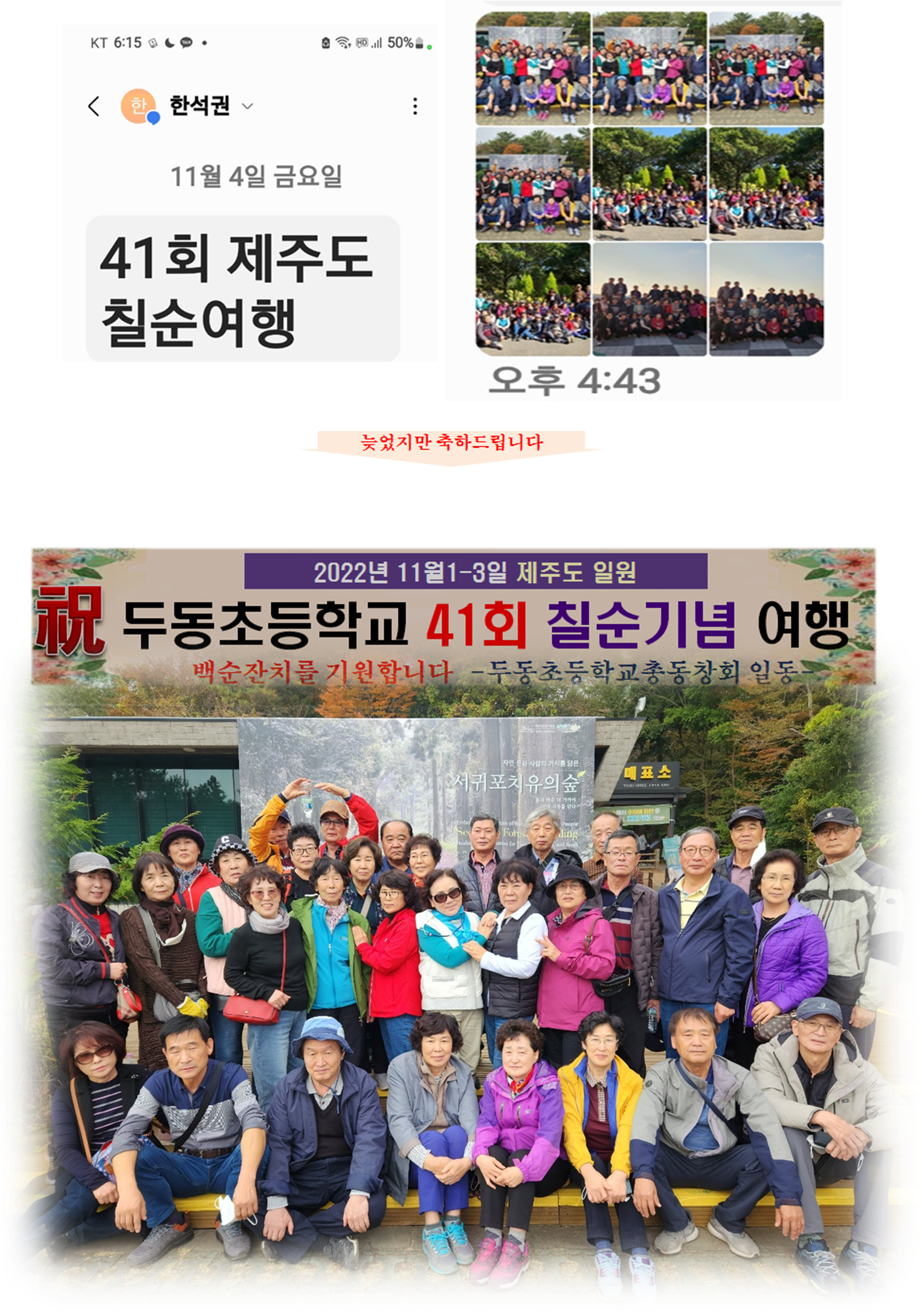 41회 칠순 여행 작성자딩동뎅(43/한대원)|작성시간22.11.07|조회수21 목록 댓글 2 글자크기 작게가 글자크기 크게가 메시지로 연락온 41회 칠순 여행을 소개해 드립니다. - 일시: 2022년 11월 1~3일- 장소: 제주도 일원- 인원: 34명 동기분 참가- 회장: 정태식 (사진제공: 41회 한석권) 다음검색 현재 게시글 추가 기능 열기 북마크 공유하기 신고 센터로 신고 댓글 댓글 2 댓글쓰기 답글쓰기 댓글 리스트 작성자산내들(29/손부홍) | 작성시간 22.11.08 정태식 박사가 칠순이라고? 작성자딩동뎅(43/한대원) 작성자 본인 여부 작성자 | 작성시간 22.11.09 정태식회장님을 아직 저는 잘 모르는 분입니다.만수무강 기원입니다.^^ 댓글 전체보기