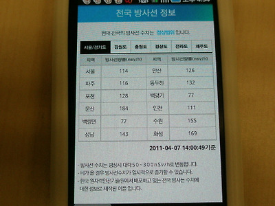 서울을 비롯해 전국 주요 도시의 방사선량을 확인할 수 있습니다. 전국을 서울/경기도, 강원도, 충청도, 경상도, 전라도, 제주도로 나누어 수치를 보여줍니다. 방사능 대피요령과 유용한 음식 정보도 제공합니다.