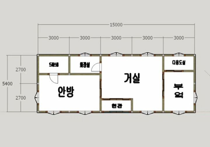 이 한옥 도면의 특징은 방이 하나라 거실과 부엌을 크게 했다는 것이 특징입니다.