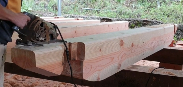 모접기 전에 모서리를 원형톱으로 빗깎아내고 모접이 날물을 끼운 홈대패로 대량 모접습니다.