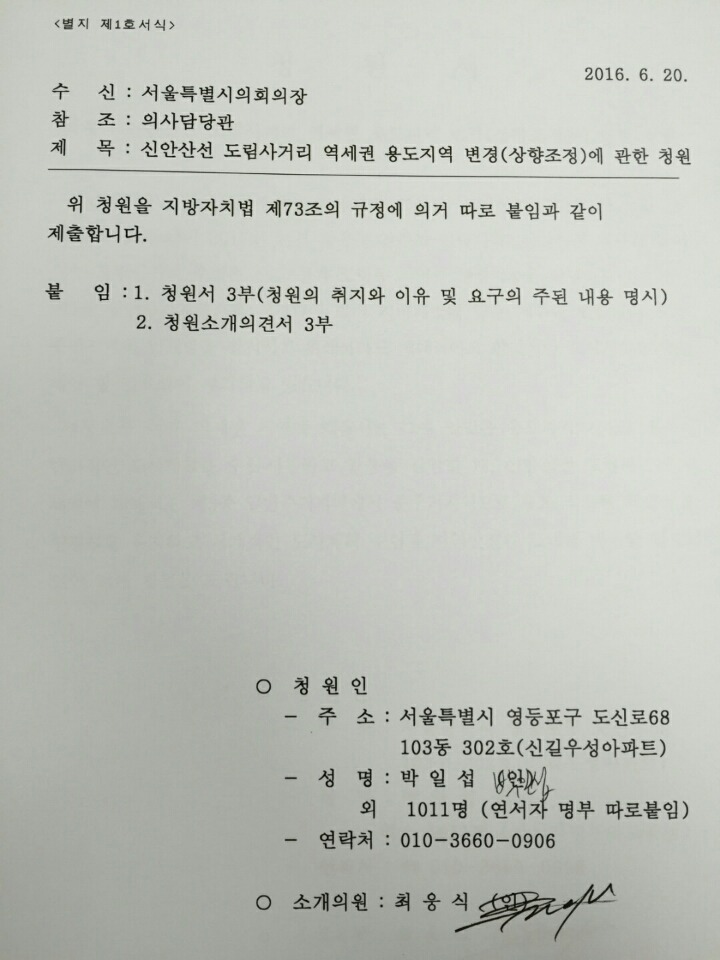 서울시 시의회 시의원인 최웅식 운영위원장에게 청원