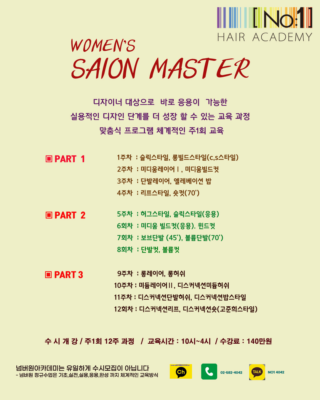 살롱마스터반은 주1회 12주 과정으로 베이직이 생략된 디자인 스타일반으로