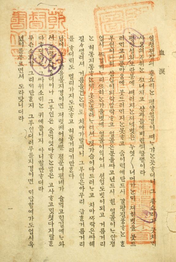 일청젼쟝의 춍소리난 평양일경이 떠나가는듯하더니 그 총쇼리가 긋치매 사람의자취는 끄너지고 산과들에 비린티끌뿐이라