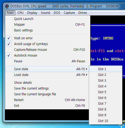 (위에서 이미 언급했지만 이 때 저장된 세이브 파일은 도스박스 폴더의 save\슬롯 번호에 있습니다.)