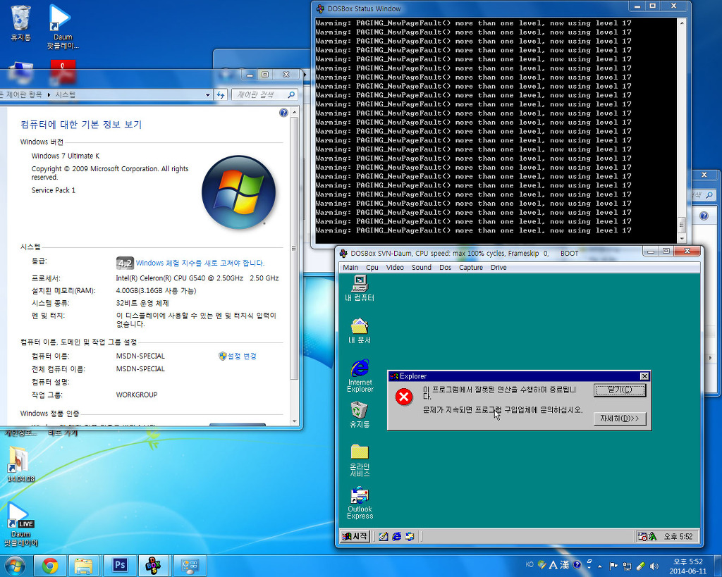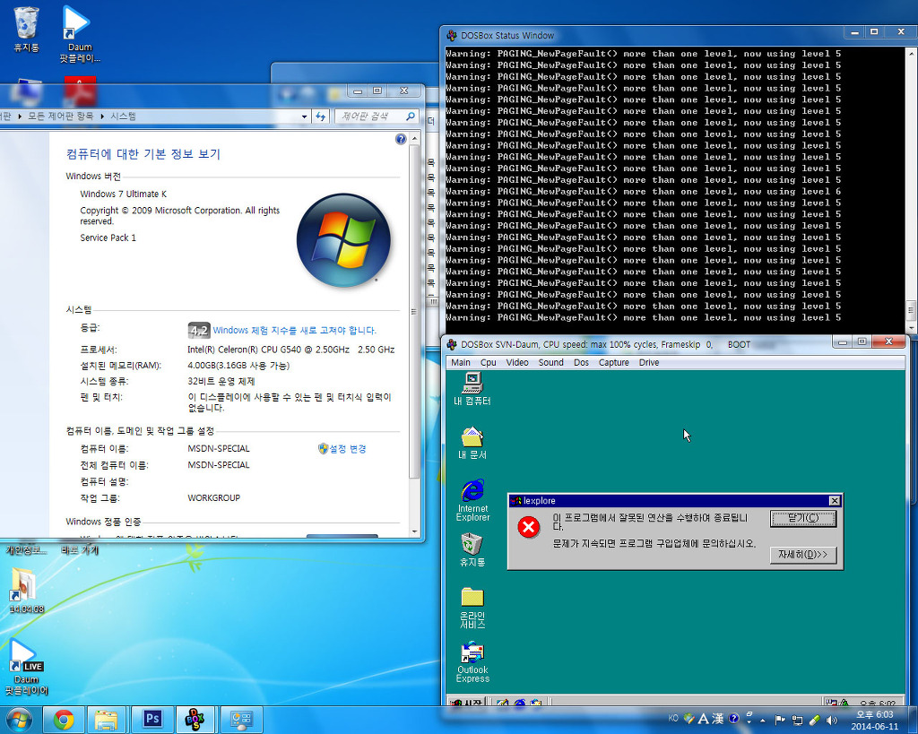 그 후에 16색 밖에 선택이 안 되고, 그 외에는 자잘한 explorer와 같은 처리오류 메시지가 반복되다가