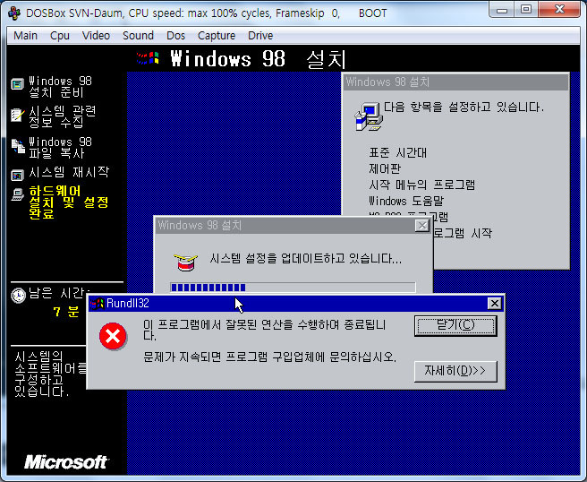 0E fatal error가 뜨지 않았고 하지만 자잘한 설정 중에 위와 같은 Rundll32 오류가 4, 5차례 떴습니다.