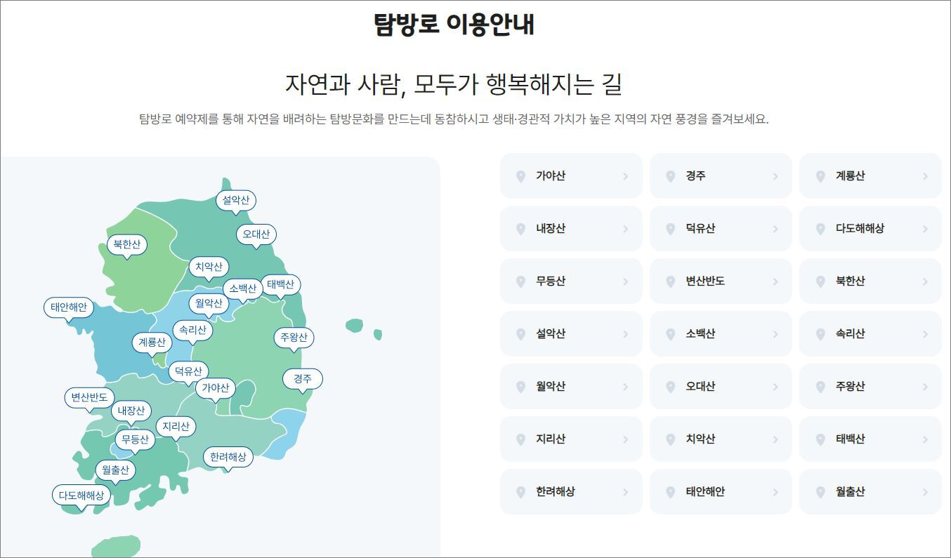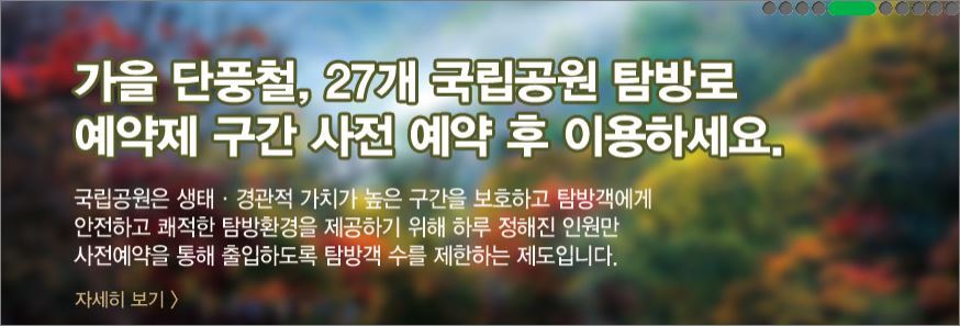 가을 단풍철 27개 국립공원 사전예약 작성자도탈 더*사*세|작성시간22.10.10|조회수431 목록 댓글 0 글자크기 작게가 글자크기 크게가 국립공원공단 예약시스템 (knps.or.kr)국립공원공단 예약시스템자연과 사람, 모두가 행복해지는 길 탐방로 예약제를 통해 자연을 배려하는 탐방문화를 만드는데 동참하시고 생태·경관적 가치가 높은 지역의 자연 풍경을 즐겨보세요.reservation.knps.or.kr 다음검색 현재 게시글 추가 기능 열기 북마크 공유하기 신고 센터로 신고 댓글 댓글 0 댓글쓰기 답글쓰기 댓글 리스트