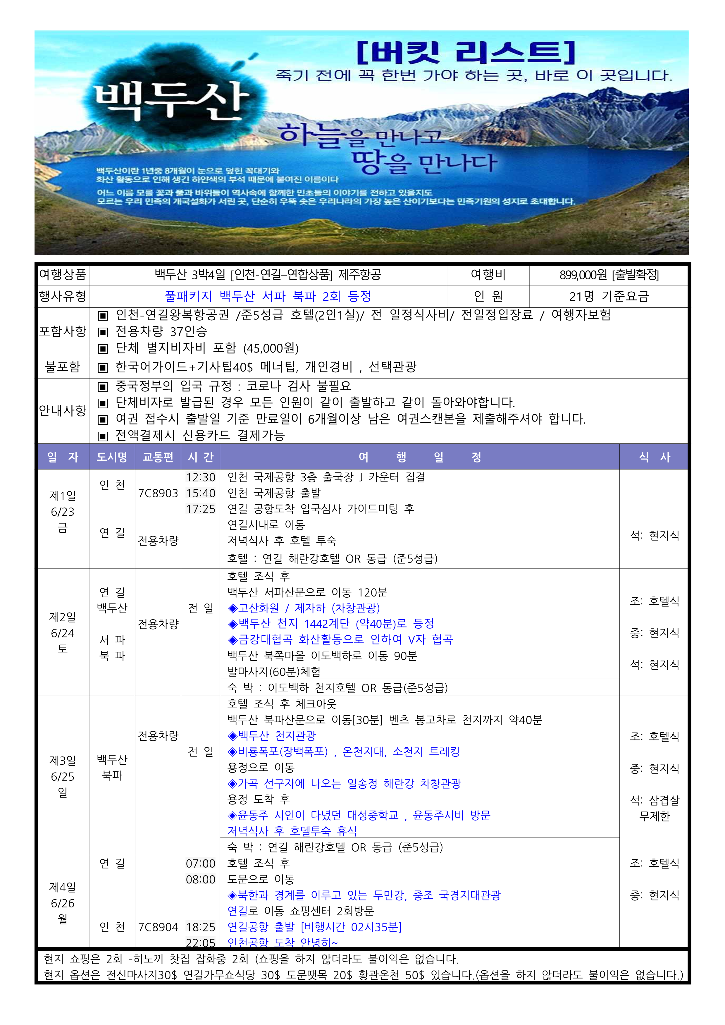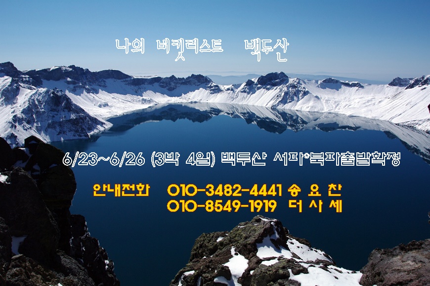 6-23~26 (3박 4일) 백두산 서파*북파🌺출발확정 -신청하기 작성자도탈 더*사*세|작성시간23.04.28|조회수794 목록 댓글 4 글자크기 작게가 글자크기 크게가 다음검색 현재 게시글 추가 기능 열기 북마크 공유하기 신고 센터로 신고 댓글 댓글 4 댓글쓰기 답글쓰기 댓글 리스트 작성자도탈 더*사*세 작성자 본인 여부 작성자 | 작성시간 23.04.28 중국 전지역 코로나로 인한 비자발급 제한조치가 전부 해제되었습니다.단체비자비용 포함된 회비입니다...출발확정이오니 많은 신청 바랍니다...감사합니다... 작성자강산에 | 작성시간 23.05.26 2갑니다 답댓글 작성자도탈 더*사*세 작성자 본인 여부 작성자 | 작성시간 23.05.27 감사합니다. 작성자강산에 | 작성시간 23.06.13 취소합니다죄송~~ 댓글 전체보기