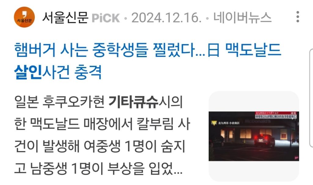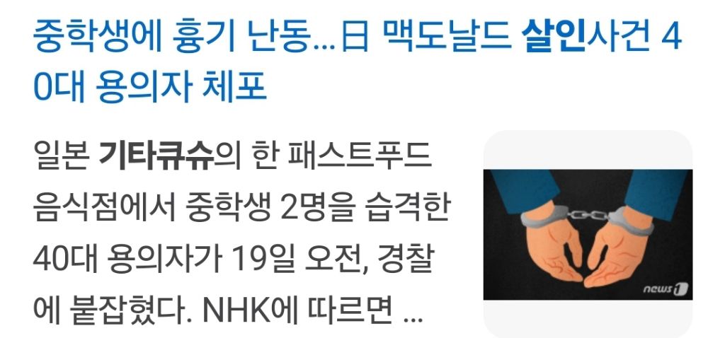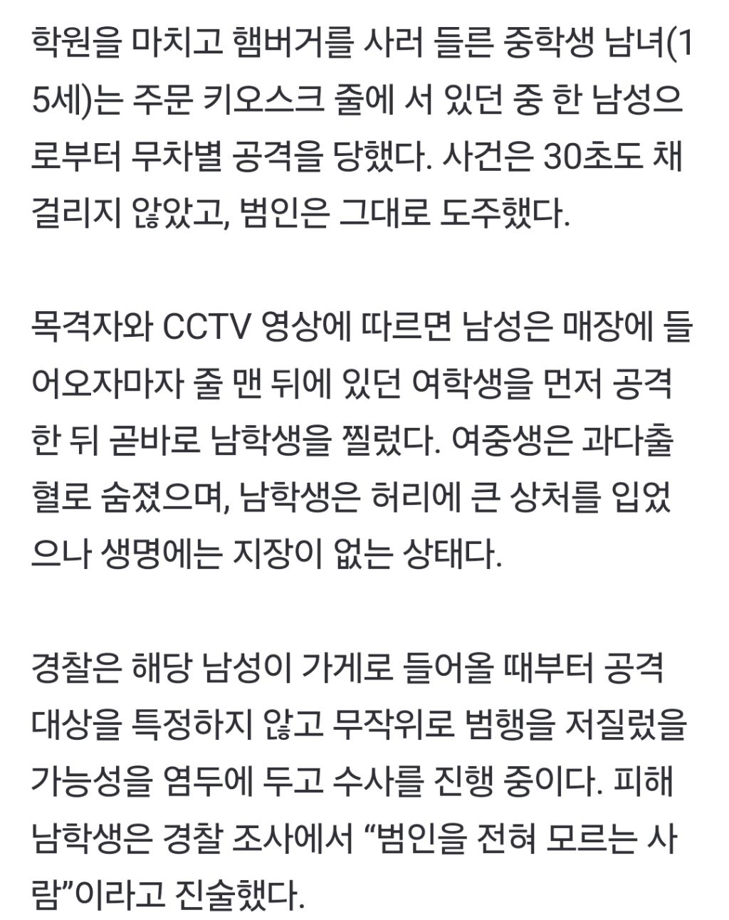 범인은 키오스크에서 주문을 위해 기다리고있던 중학생2명에게 흉기를 휘두르고 도주하였다.