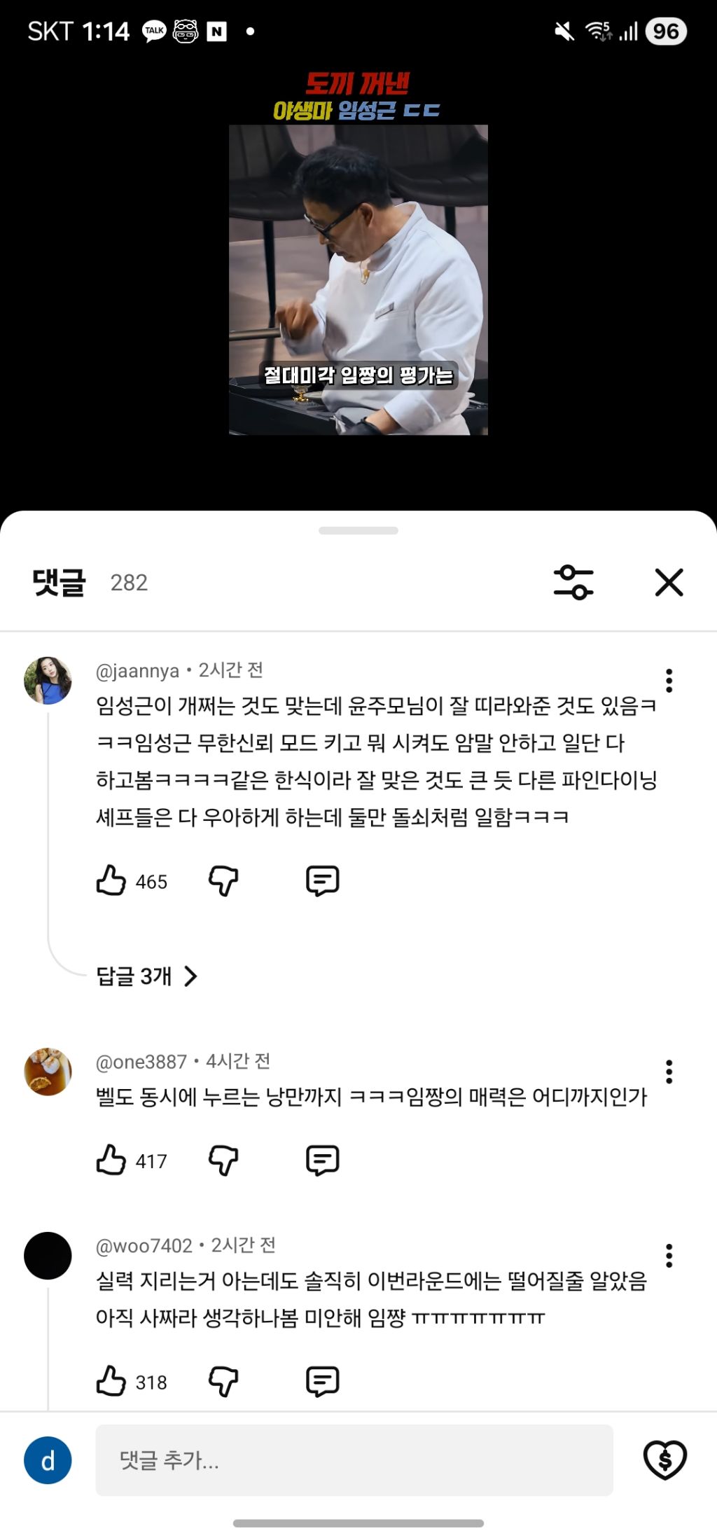 답댓글 작성자햇빛달빛별빛 작성자 본인 여부 작성자 작성시간 25.12.31 참고로 임짱 저분 혼자셔서 많이 점잖으셨음요 ㅋㅋㅋ 한식대첩에선 두분 만담콤비였음 ㅋㅋㅋㅋㅋㅋ