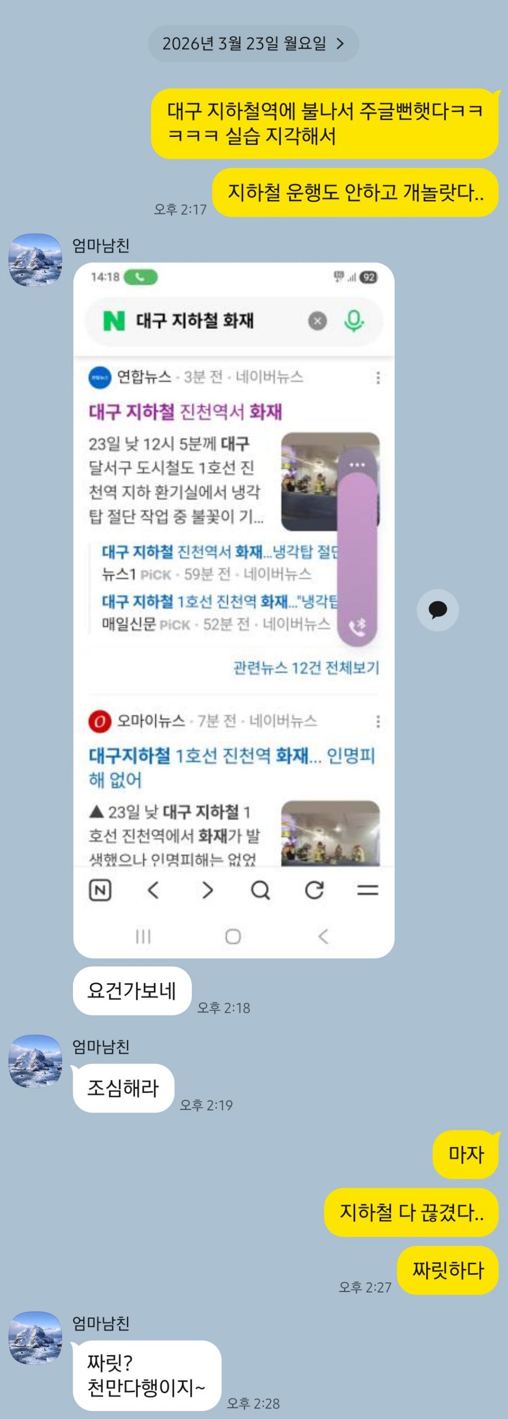 작성자피카츄가 빚갚쥬 작성시간 26.03.24 아니 하필 대구 지하철에서 화재가......