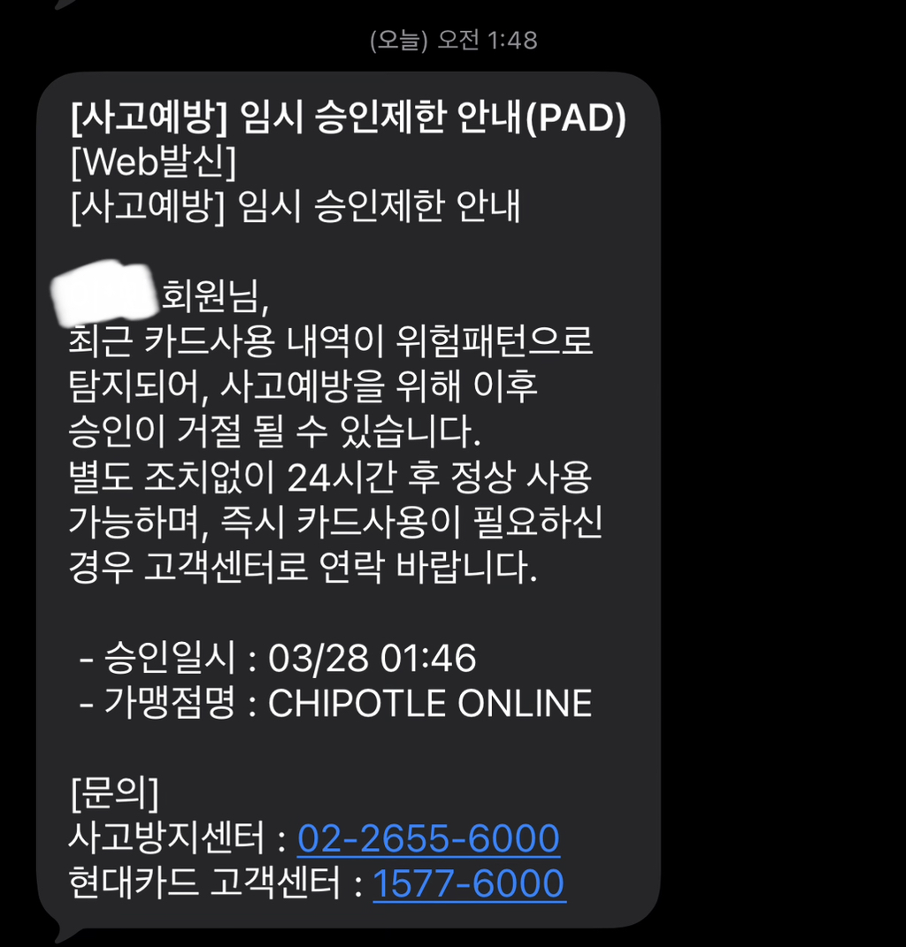 잠이 확깨서 전화해 보니 다행히 결제 금액은 없고 0딸라로 결제 시도가 여러번 있었다고..