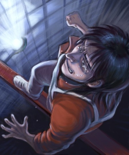 카이지(이렇게 출발이 늦은 건 치명적...! 이렇게 폭이 좁은 철골이니, 먼저 간 사람을 앞지르는 건 불가능해...!)