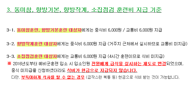 자꾸 이걸 갖고와서 "이거봐라 1식 6000원이다" 라고 하시는데, 이건 경비(여비)에요. 훈련받으러 오며 가며 드는 식비와 교통비, 숙박비를 하란거지 경비가 1식 6000원이니까 동원 예비군 훈련을 받을 때도 1식 6000원이다라는게 아니에요.