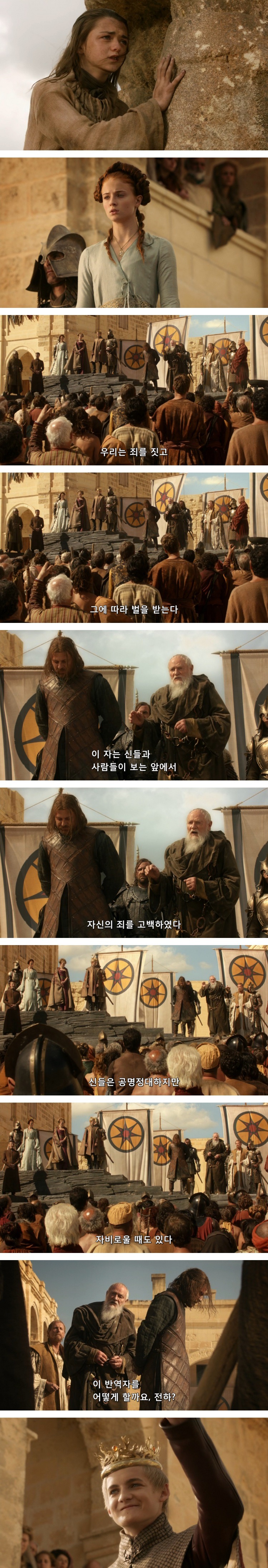 네드는 결국 조프리만이 정당한 왕이라며, 조프리의 왕위를 인정하고 자신의 반역죄를 고백함