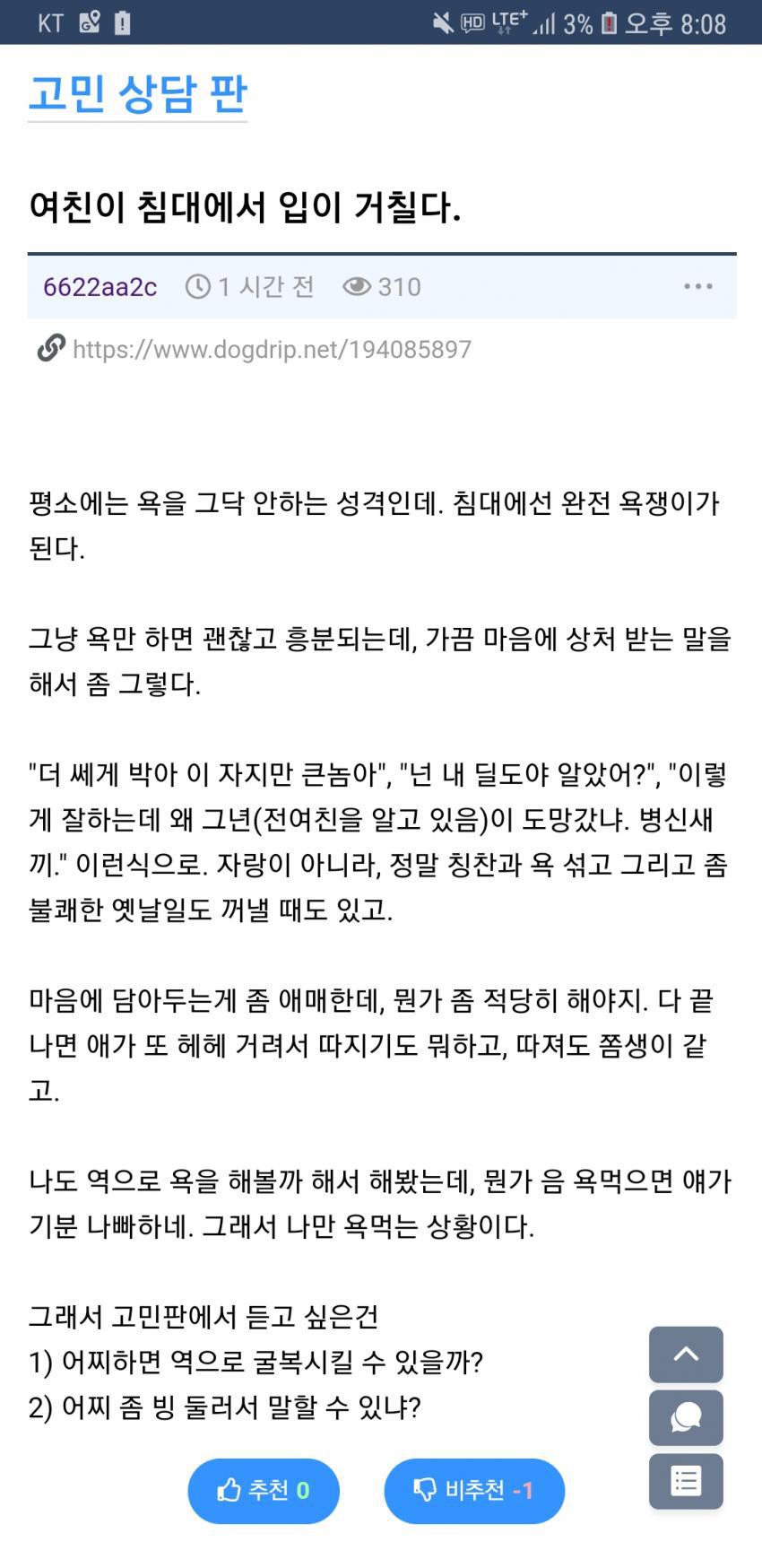 도탁스 (DOTAX) 여친이 침대에서 입이 거칠어서 고민인 남자 작성시간19.01.28|조회수16,251 목록 댓글 46 글자크기 작게가 글자크기 크게가 다음검색 현재 게시글 추가 기능 열기 북마크 공유하기 신고 센터로 신고 댓글 46 댓글 리스트 작성시간 19.01.28 그저 부럽 작성시간 19.01.28 자랑같기도 하고...고민같기도 하고 애매하다 ㅅㅂ 작성시간 19.01.28 기만자 작성시간 19.01.28 부럽다 ㄷㄷ 작성시간 19.01.28 다 전남친의 작품이니 전남친에게 물어본다 카페 방문해 더 많은 댓글 만나기!