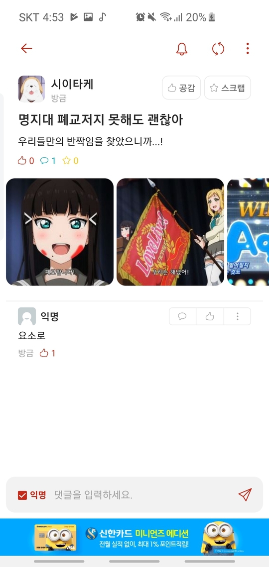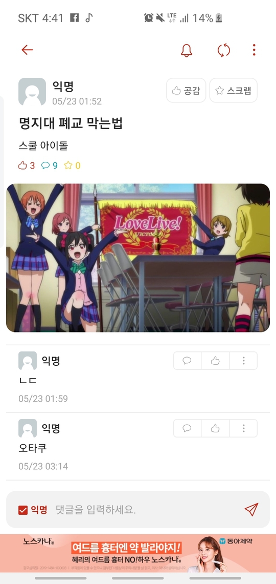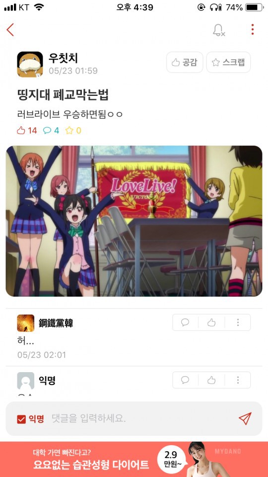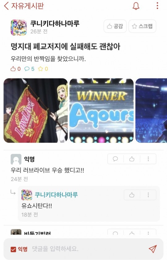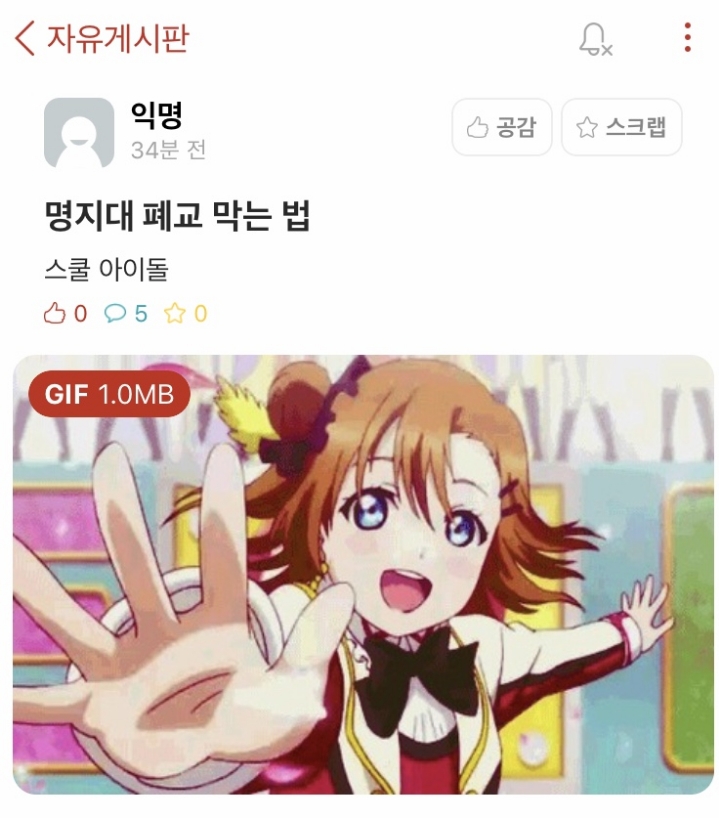 저 짤로 올린 애니가 러브라이브 인데 내용이 폐교위기의 학교를 아이돌 활동으로 살린다는 거임