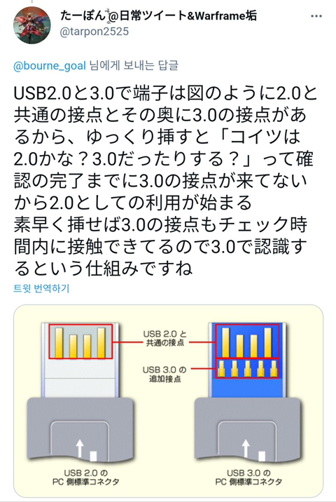 USB2.0과 3.0은 아래 그림처럼 2.0 공통 접점이 있고 더 안쪽에 3.0용 접점이 있기때문에 천천히 꽂으면