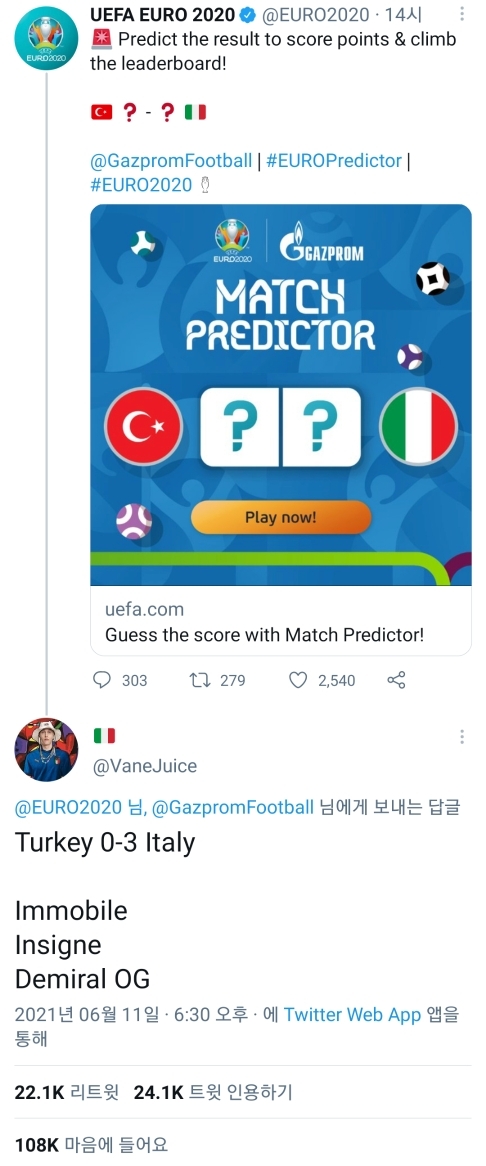 [스크랩] 오늘자 터키 vs 이탈리아 ㅎㄷㄷ한 예언 작성자퀴리부인|작성시간21.06.12|조회수4,339 목록 댓글 4 글자크기 작게가 글자크기 크게가 득점자, 스코어 정확히 맞춤 다음검색 스크랩 원문 : 樂soccer 현재 게시글 추가 기능 열기 북마크 공유하기 신고 센터로 신고 댓글 댓글 4 댓글쓰기 답글쓰기 댓글 리스트 작성자[NO:MORE] | 작성시간 21.06.12 자책골을 ㄷㄷ 작성자Poleon | 작성시간 21.06.12 로또 한번사보지 작성자그 손을 내밀어줘 | 작성시간 21.06.12 ㅁㅊ ㄷㄷ 작성자전 소 미 | 작성시간 21.06.12 ㄷㄷㄷ 댓글 전체보기