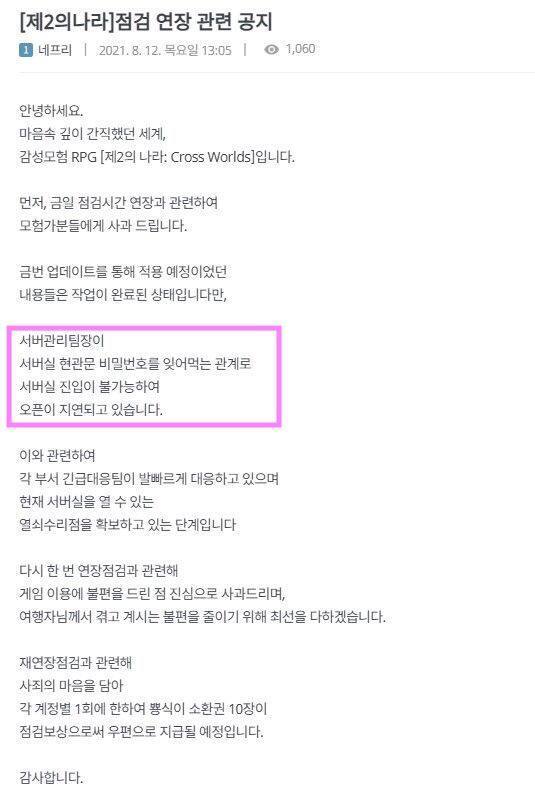 어느게임이 점검 연장을 한 어처구니 없는 이유;.jpg 작성자KITSUNE’|작성시간21.08.19|조회수8,275 목록 댓글 17 글자크기 작게가 글자크기 크게가 보안 (물리) 다음검색 현재 게시글 추가 기능 열기 북마크 공유하기 신고 센터로 신고 댓글 댓글 17 댓글쓰기 답글쓰기 댓글 리스트 작성자리쁜이 | 작성시간 21.08.19 뭔데 ㅋㅋㅋㅋㅋㅋㅋㅋㅋ 작성자눈팅하다댓글씀 | 작성시간 21.08.19 ㅋㅋㅋㅋㅋㅋㅋㅋㅋㅋㅋㅋㅋ가지가지 나뭇가지 작성자세상에나 이게뭐야 | 작성시간 21.08.19 ㅋㅋㅋㅋㅋㅋㅋㅋㅋㅋㅋ 작성자복숭아조아 | 작성시간 21.08.19 서버실이 약간 열일이 없는 곳인가보네 ㄷㄷ 작성자하늘이기여어 | 작성시간 21.08.19 그래도 이유 투명하게 알려주는거보니 갓겜이네 ㅋㅋㅋㅋㅋㅋㅋ 댓글 전체보기