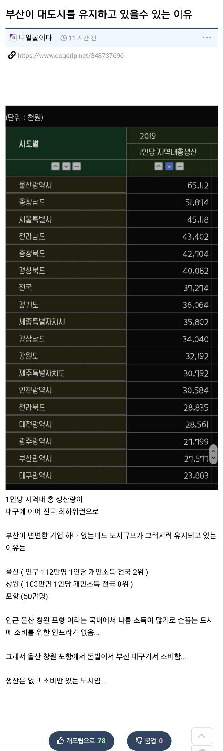 작성자살빼자 너무쪘다 작성시간 21.09.08 부산은 공기업 공무원말고 젊은 사람들은 가지도않는 부산 끄트머리에 공장몇개랑 항만부두빼면 직장없음