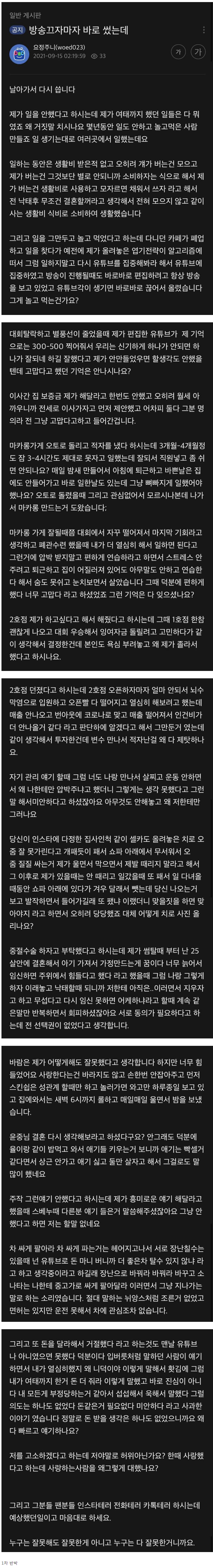 요정주니 방종 후 김성현 해명 방송