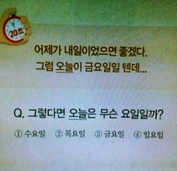작성시간 22.01.02 어제가 목요일이면 좋겠다 그럼 오늘이 금요일일텐데가 말이 되니까 목요일자리가 원래글짜론 내일이므로 내일의전날= 수요일이라 수요일도 말이되는거