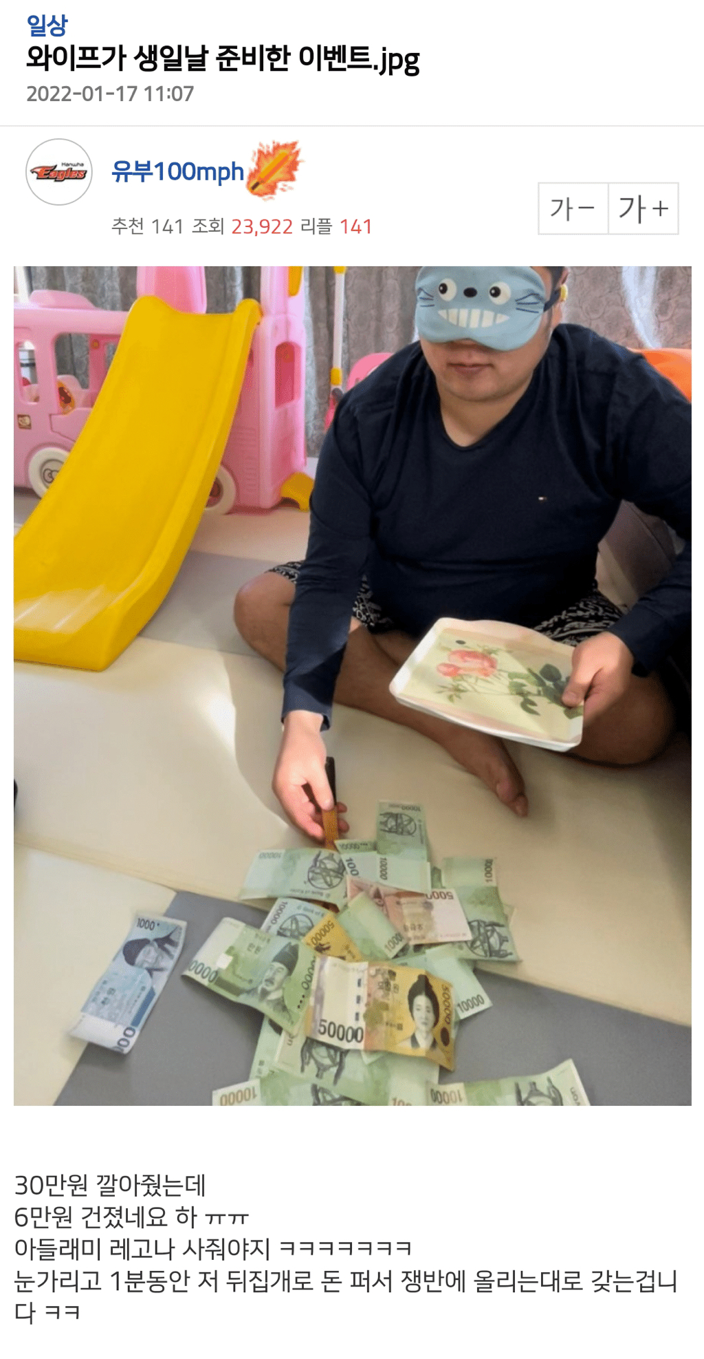 [스크랩] 와이프가 생일날 준비한 이벤트 작성자똥개|작성시간22.01.17|조회수8,613 목록 댓글 19 글자크기 작게가 글자크기 크게가 다음검색 스크랩 원문 : 이종격투기 현재 게시글 추가 기능 열기 북마크 공유하기 신고 센터로 신고 댓글 댓글 19 댓글쓰기 답글쓰기 댓글 리스트 작성자도탁클라스 | 작성시간 22.01.17 이거 좋네 ㅋ 작성자QuickMan | 작성시간 22.01.17 ㅋㅋㅋㅋㅋㅋㅋㅋㅋㅋㅋㅋㅋㅋ 작성자믿음소망사랑중최고는망사 | 작성시간 22.01.17 ㅋㅋㅋㅋㅋㅋㅋㅋㅋㅋㅋㅋㅋㅋㅋㅋㅋㅋㅋㅋㅋㅋ 작성자나..아니라니까 | 작성시간 22.01.18 재밌넼ㅋㅋㅋㅋ 작성자야아아압 | 작성시간 22.01.18 ㅋㅋㅋㅋㅋㅋㅋㅋㅋㅋㅋㅋㅋㅋㅋㅋ 댓글 전체보기