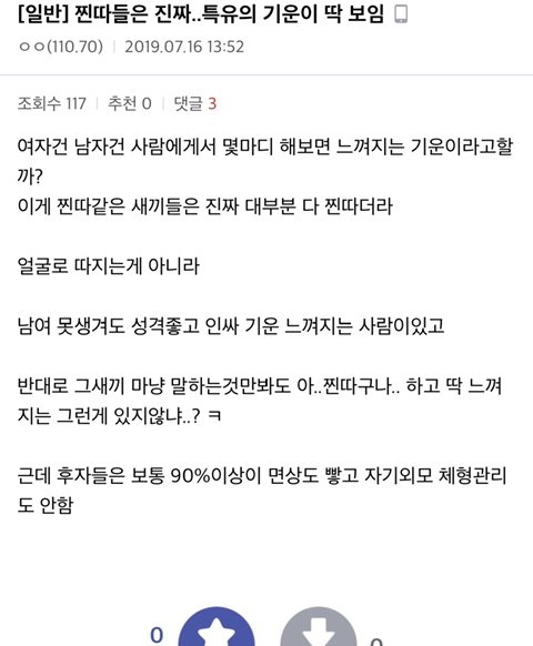 작성자표시할 항목이 없습니다 작성시간 22.05.17 태어나서 이쁜 찐따를 딱 한번봄. 이쁜데 말할때나 행동에서 느낌이 딱옴.