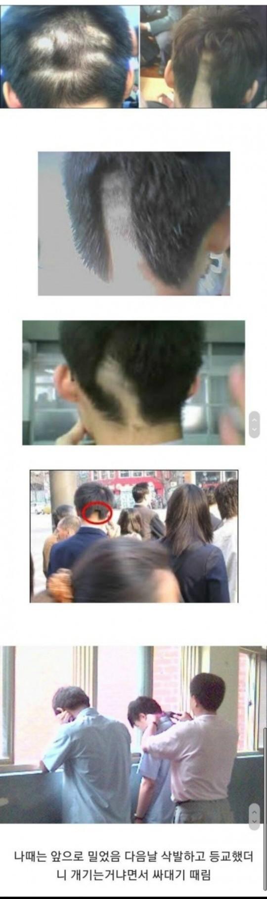 작성시간 22.07.20 2006년돈가 나 중학생때 반삭하고 음각 스크래치 넣는게 나름 유행이었음. 한줄이나 두줄 직선으로 짧게 넣는 정도는 애교로 넘어가줬는데, 어떤 일진 하나가 두꺼운 번개모양으로 귀보다 뒤까지 스크래치를 넣고 학주한테 걸리는 바람에 다음날 학교 복도에서 스님으로 발견됨.