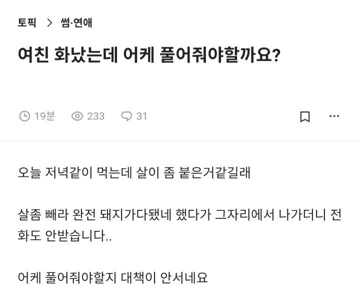 여친 화났는데 어떻게 풀어줘야할까요? 작성자한 여름밤의 꿈|작성시간22.07.20|조회수8,400 목록 댓글 28 글자크기 작게가 글자크기 크게가 출처 블라인드 다음검색 현재 게시글 추가 기능 열기 북마크 공유하기 신고 센터로 신고 댓글 댓글 28 댓글쓰기 답글쓰기 댓글 리스트 작성자E SENS | 작성시간 22.07.20 돼지라고하면 당연히 화내지ㅋㅋㅋㅋㅋㅋㅋㅋ 작성자Prosper | 작성시간 22.07.20 지무덤을 지가 팠구만 뭘 작성자도박왕김파산 | 작성시간 22.07.20 ○○야(여자친구이름) 친구들 구워줄게 가자~ 작성자돌아온모모롤 | 작성시간 22.07.20 밥먹는데 그러냐 ㅠ 작성자고먐미 고양이 | 작성시간 22.07.20 그냥 헤어지고 싶은건데? 가족한테도 저 따구로 말 안한다 댓글 전체보기