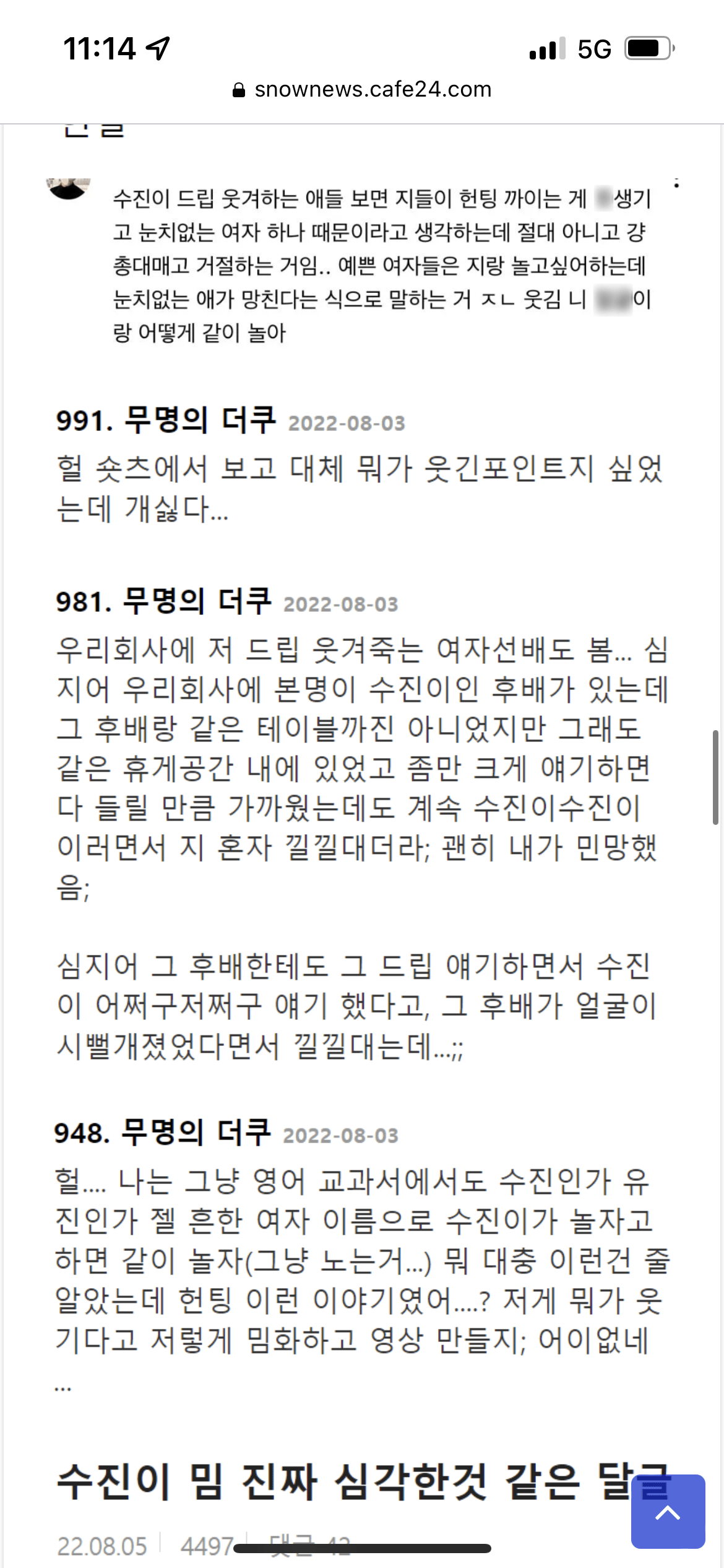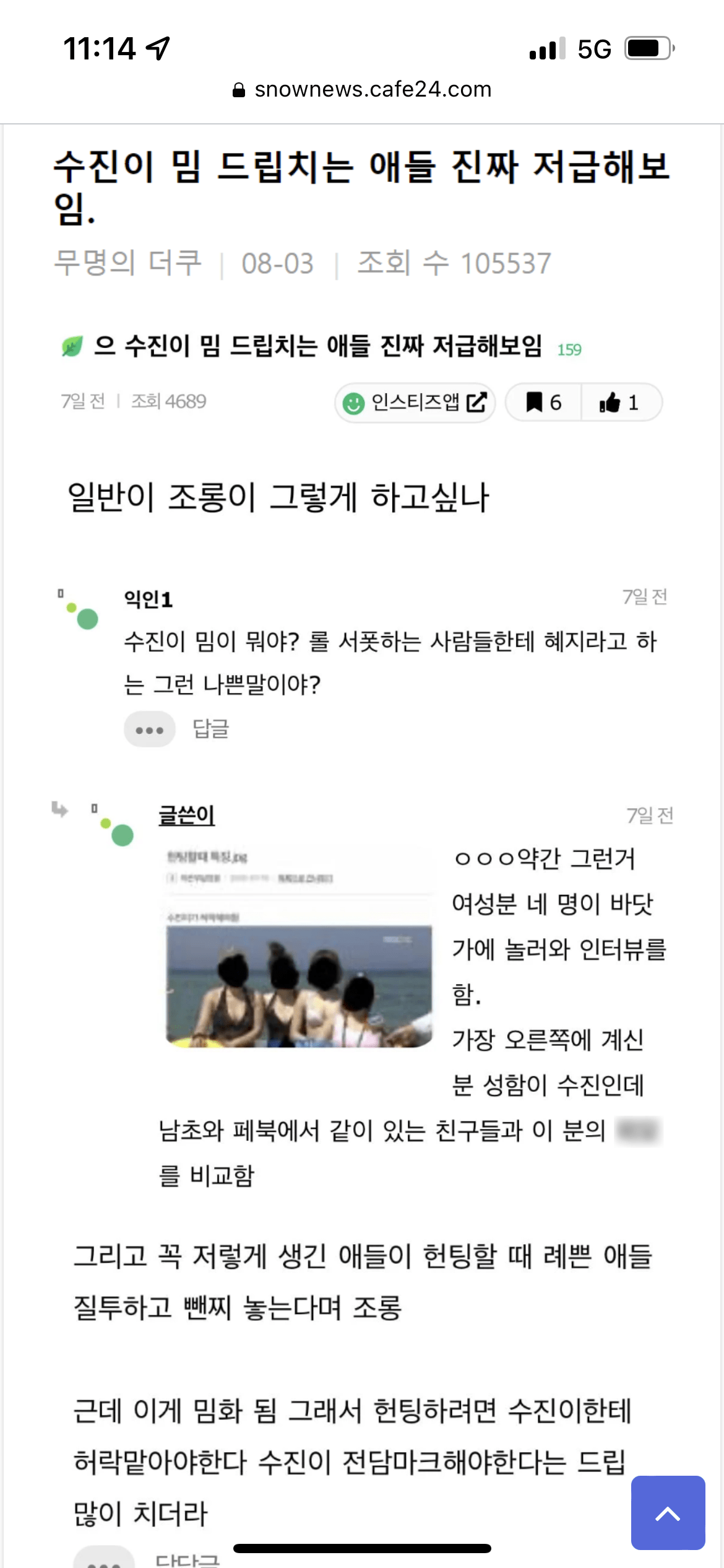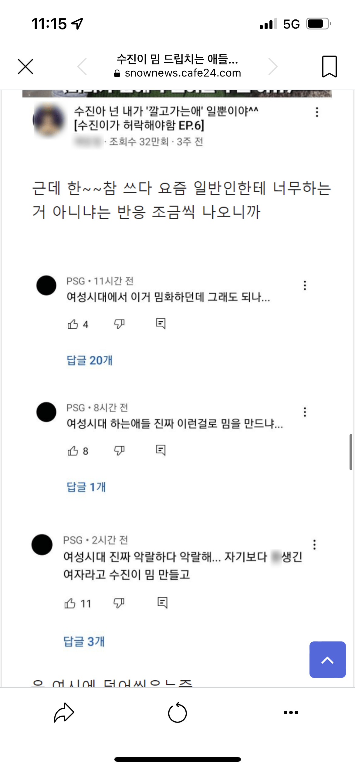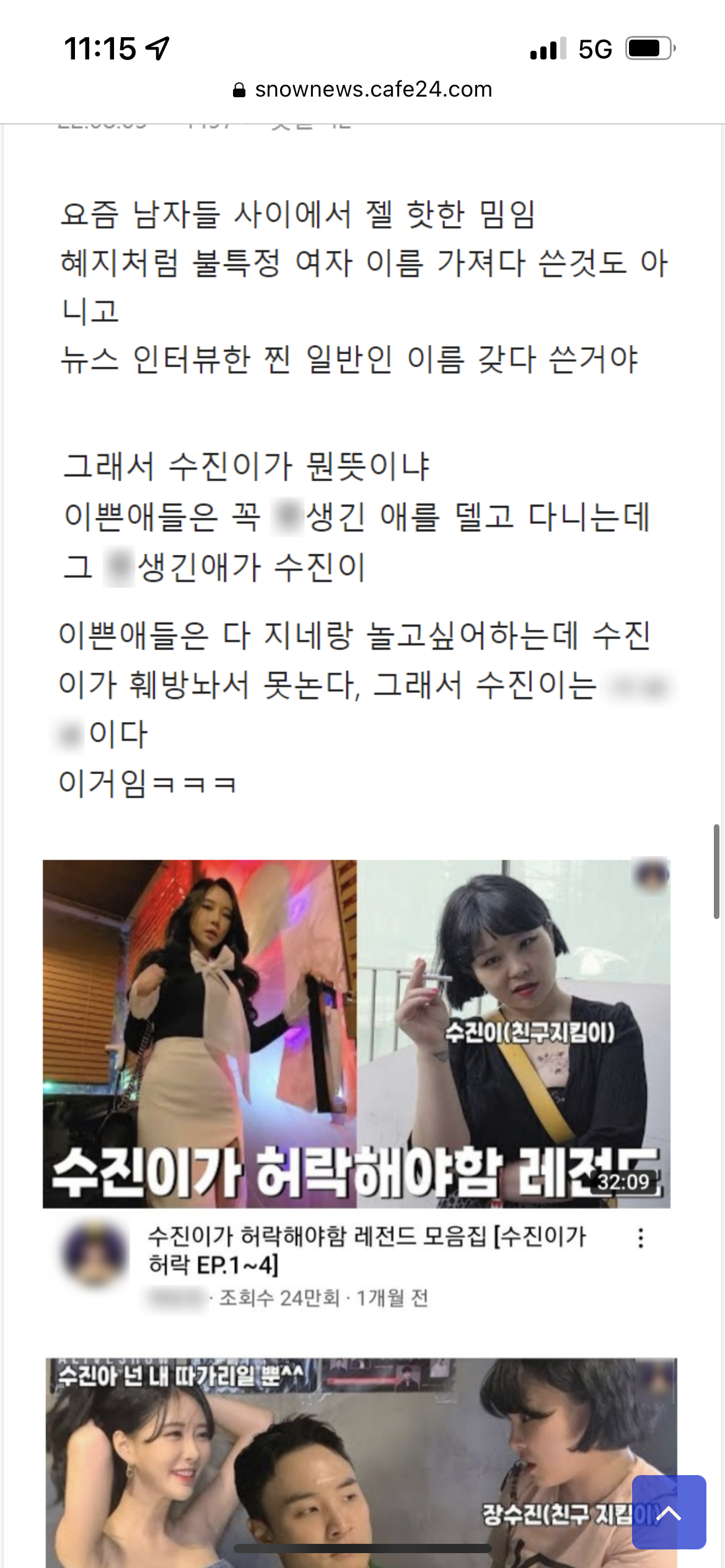 요즘 논란이라는 수진이 밈 jpg 작성자풉키풉키~|작성시간22.08.09|조회수24,893 목록 댓글 138 글자크기 작게가 글자크기 크게가 수진이 밈은 일반인 조롱이라 쓰면 안된다는 게 주류 의견 다음검색 현재 게시글 추가 기능 열기 북마크 공유하기 신고 센터로 신고 댓글 댓글 138 댓글쓰기 답글쓰기 댓글 리스트 작성자제2작전사령관 | 작성시간 22.08.09 혜정이 밖에 모르는데 작성자Snake.Me[Neiv] | 작성시간 22.08.09 그냥 대부분 저쪽 활동하는분들 유튜브에 알고리즘 뜨는거아님? 진짜 처음들어보고 모르는데 작성자김세정좋아요 | 작성시간 22.08.09 모르는사람이 꽤 많네요 . 진짜 오래된 유명한 밈인데 작성자근드릿나 | 작성시간 22.08.09 수진이한테허락받아야된다는드립 최근에앎원본은 몰랐네 작성자쓰파클링체리에이드 | 작성시간 23.08.03 도탁에서 한번정도 본듯? 댓글 전체보기