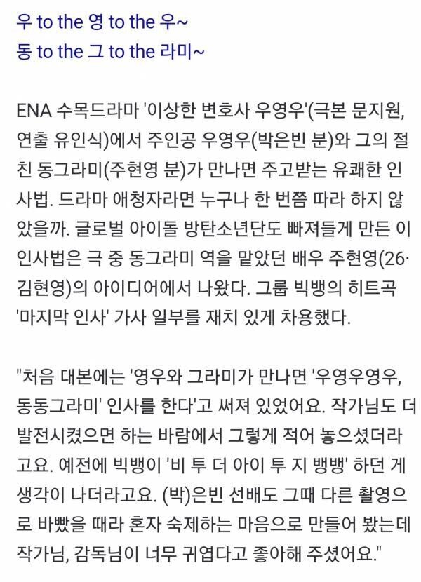 작성시간 22.08.24 ㅋㅋㅋㅋㅋ누가 우영우 안보는 사람이 보는 우영우 인사법에서 저거 언급햇는대 ㅋㅋㅋ